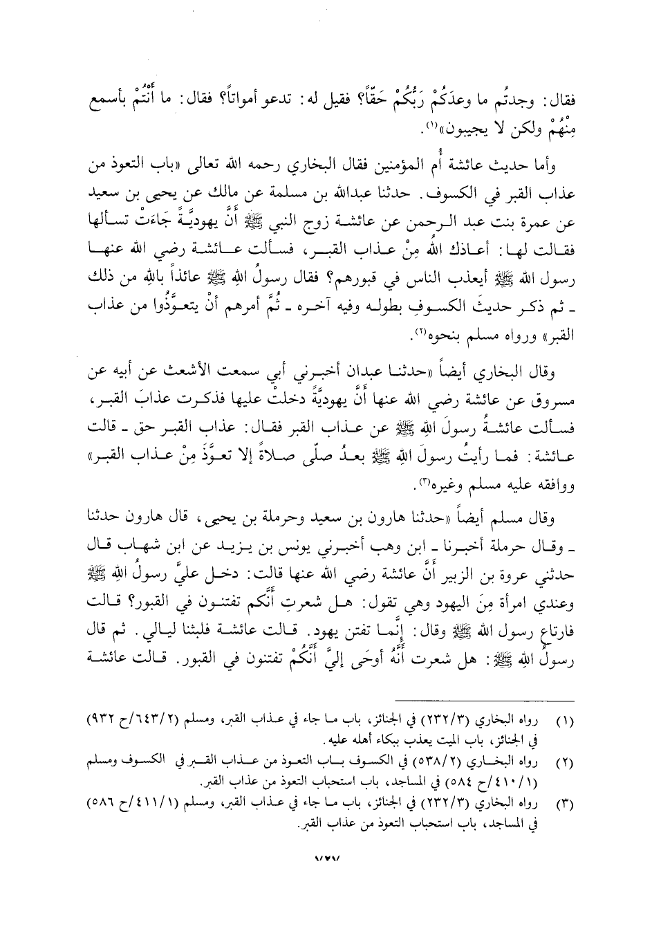 وَأَمَّا حَدِيثُ عَائِشَةَ أُمِّ الْمُؤْمِنِينَ فَقَالَ الْبُخَارِيُّ رَحِمَهُ اللَّهُ تَعَالَى: "بَابُ التَّعَوُّذِ مِنْ عَذَابِ الْقَبْرِ فِي الْكُسُوفِ" حَدَّثَنَا عَبْدُ اللَّهِ بْنُ مَسْلَمَةَ عَنْ مَالِكٍ عَنْ يَحْيَى بْنِ سَعِيدٍ عَنْ عَمْرَةَ بِنْتِ عَبْدِ الرَّحْمَنِ عَنْ عَائِشَةَ زَوْجِ النَّبِيِّ صَلَّى اللَّهُ عَلَيْهِ وَسَلَّمَ أَنَّ يَهُودِيَّةً جَاءَتْ تَسْأَلُهَا فَقَالَتْ لَهَا: أَعَاذَكِ اللَّهُ مِنْ عَذَابِ الْقَبْرِ, فَسَأَلَتْ عَائِشَةُ رَضِيَ اللَّهُ عَنْهَا رَسُولَ اللَّهِ صَلَّى اللَّهُ عَلَيْهِ وَسَلَّمَ: أَيُعَذَّبُ النَّاسُ فِي قُبُورِهِمْ؟ فَقَالَ رَسُولُ اللَّهِ صَلَّى اللَّهُ عَلَيْهِ وَسَلَّمَ عَائِذًا بِاللَّهِ مِنْ ذَلِكَ -ثُمَّ ذَكَرَ حَدِيثَ الْكُسُوفِ بِطُولِهِ وَفِيهِ آخِرُهُ- ثُمَّ أَمَرَهُمْ أَنْ يَتَعَوَّذُوا مِنْ عَذَابِ الْقَبْرِ, وَرَوَاهُ مُسْلِمٌ بِنَحْوِهِ2.