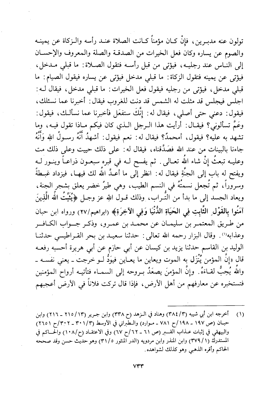 1 أخرجه ابن أبي شيبة "3/ 384" وهناد في الزهد "ح338" وابن جرير "13/ 215، 216" وابن حبان "ص197، 198/ ح781, موارد" والطبراني في الأوسط "3/ 301، 302/ ح2651" والبيهقي في إثبات عذاب القبر "ص61، 62/ ح67" وفي الاعتقاد "ح108" والحاكم في المستدرك "1/ 379" وابن المنذر وابن مردويه "الدر المنثور 5/ 31" وهو حديث حسن, وقد صححه الحاكم وأقره الذهبي, وهو كذلك لشواهده.