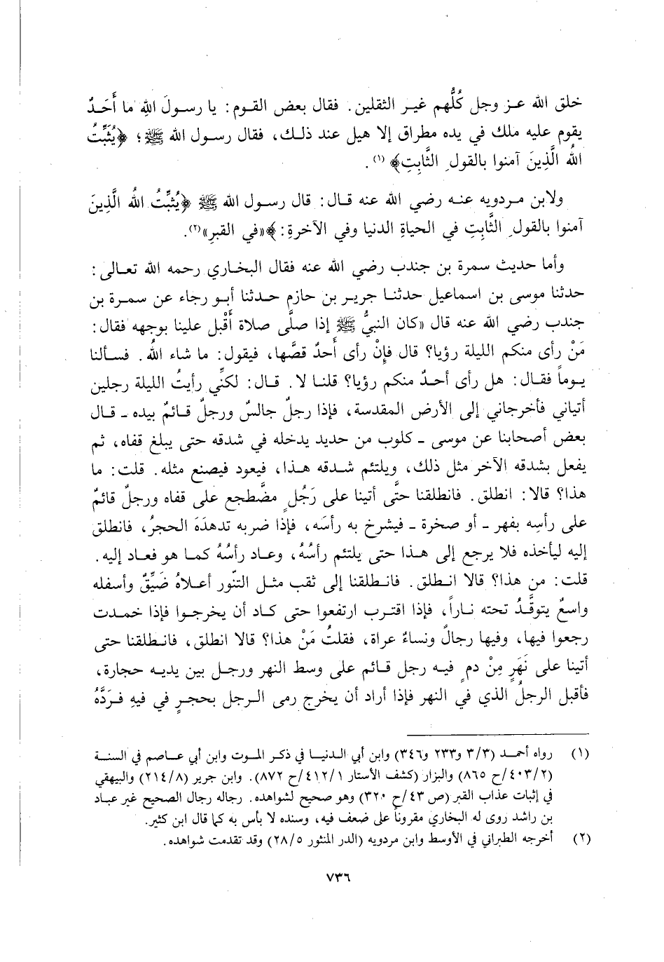 1 رواه أحمد "3/ 3 و233 و346" وابن أبي الدنيا في ذكر الموت, وابن أبي عاصم في السنة "2/ 403/ ح865" والبزار "كشف الأستار "1/ 412/ ح872" وابن جرير "8/ 214" والبيهقي في إثبات عذاب القبر "ص43/ ح320" وهو صحيح لشواهده. رجاله رجال الصحيح غير عباد بن راشد, روى له البخاري مقرونا على ضعف فيه، وسنده لا بأس به كما قال ابن كثير.