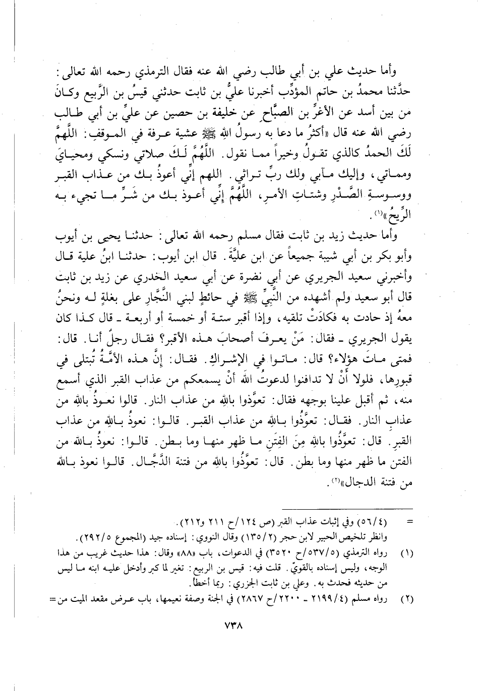 وَأَمَّا حَدِيثُ زَيْدِ بْنِ ثَابِتٍ فَقَالَ مُسْلِمٌ رَحِمَهُ اللَّهُ تَعَالَى: حَدَّثَنَا يَحْيَى بْنُ أَيُّوبَ وَأَبُو بَكْرِ بْنُ أَبِي شَيْبَةَ جَمِيعًا عَنِ ابْنِ عُلَيَّةَ قَالَ ابْنُ أَيُّوبَ: حَدَّثَنَا ابْنُ عُلَيَّةَ قَالَ: وَأَخْبَرَنِي سَعِيدٌ الْجُرَيْرِيُّ عَنْ أَبِي نَضْرَةَ عَنْ أَبِي سَعِيدٍ الْخُدْرِيِّ عَنْ زَيْدِ بْنِ ثَابِتٍ قَالَ أَبُو سَعِيدٍ: وَلَمْ أَشْهَدْهُ مِنَ النَّبِيِّ صَلَّى اللَّهُ عَلَيْهِ وَسَلَّمَ فِي حَائِطٍ لِبَنِي النَّجَّارِ عَلَى بَغْلَةٍ لَهُ وَنَحْنُ مَعَهُ إِذْ حَادَتْ بِهِ فَكَادَتْ تُلْقِيهِ, وَإِذَا أَقْبَرَ سِتَّةً أَوْ خَمْسَةً أَوْ أَرْبَعَةً قَالَ: كَذَا كَانَ يَقُولُ الْجُرَيْرِيُّ فَقَالَ: "مَنْ يَعْرِفُ أَصْحَابَ هَذِهِ الْأَقْبُرِ"؟ فَقَالَ رَجُلٌ: أَنَا قَالَ: "فَمَتَى مَاتَ هَؤُلَاءِ "؟ قَالَ: مَاتُوا فِي الْإِشْرَاكِ فَقَالَ: "إِنَّ هَذِهِ الْأُمَّةَ تُبْتَلَى فِي قُبُورِهَا, فَلَوْلَا أَنْ لَا تَدَافَنُوا لَدَعَوْتُ اللَّهَ أَنْ يُسْمِعَكُمْ مِنْ عَذَابِ الْقَبْرِ الَّذِي أَسْمَعُ مِنْهُ" ثُمَّ أَقْبَلَ عَلَيْنَا بِوَجْهِهِ فَقَالَ: "تَعَوَّذُوا بِاللَّهِ مِنْ عَذَابِ النَّارِ" قَالُوا: نَعُوذُ بِاللَّهِ مِنْ عَذَابِ النَّارِ فَقَالَ: "تَعَوَّذُوا بِاللَّهِ مِنْ عَذَابِ الْقَبْرِ" قَالُوا: نَعُوذُ بِاللَّهِ مِنْ عَذَابِ الْقَبْرِ قَالَ: "تَعَوَّذُوا بِاللَّهِ مِنَ الْفِتَنِ مَا ظَهَرَ مِنْهَا وَمَا بَطَنَ" قَالُوا: نَعُوذُ بِاللَّهِ مِنَ الْفِتَنِ مَا ظَهَرَ مِنْهَا وَمَا بَطَنَ قَالَ: "تَعَوَّذُوا بِاللَّهِ مِنْ فِتْنَةِ الدَّجَّالِ" قَالُوا: نَعُوذُ بِاللَّهِ مِنْ فِتْنَةِ الدَّجَّالِ2.