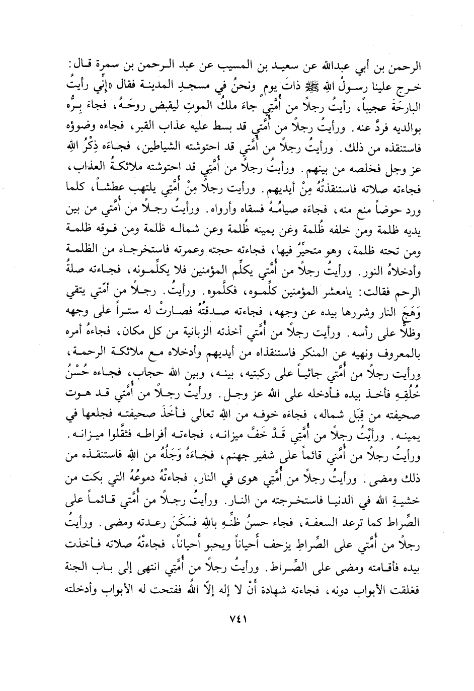 الرَّحْمَنِ بْنِ أَبِي عَبْدِ اللَّهِ عَنْ سَعِيدِ بْنِ الْمُسَيَّبِ عَنْ عَبْدِ الرَّحْمَنِ بْنِ سَمُرَةَ قَالَ: خَرَجَ عَلَيْنَا رَسُولُ اللَّهِ صَلَّى اللَّهُ عَلَيْهِ وَسَلَّمَ ذَاتَ يَوْمٍ وَنَحْنُ فِي مَسْجِدِ الْمَدِينَةِ فَقَالَ: "إِنِّي رَأَيْتُ الْبَارِحَةَ عَجِيبًا, رَأَيْتُ رَجُلًا مِنْ أُمَّتِي جَاءَ مَلَكُ الْمَوْتِ لِيَقْبِضَ رُوحَهُ فَجَاءَ بَرُّهُ بِوَالِدَيْهِ فَرَدَّ عَنْهُ, وَرَأَيْتُ رَجُلًا مِنْ أُمَّتِي قَدْ بُسِطَ عَلَيْهِ عَذَابُ القبر فجاءه وضوءه فَاسْتَنْقَذَهُ مِنْ ذَلِكَ, وَرَأَيْتُ رَجُلًا مِنْ أُمَّتِي قَدِ احْتَوَشَتْهُ الشَّيَاطِينُ فَجَاءَهُ ذِكْرُ اللَّهِ عَزَّ وَجَلَّ فَخَلَّصَهُ مِنْ بَيْنِهِمْ وَرَأَيْتُ رَجُلًا مِنْ أُمَّتِي قَدِ احْتَوَشَتْهُ مَلَائِكَةُ الْعَذَابِ فَجَاءَتْهُ صَلَاتُهُ فَاسْتَنْقَذَتْهُ مِنْ أَيْدِيهِمْ, وَرَأَيْتُ رَجُلًا مِنْ أُمَّتِي يَلْتَهِبُ عَطَشًا كُلَّمَا وَرَدَ حَوْضًا مُنِعَ مِنْهُ, فَجَاءَهُ صِيَامُهُ فَسَقَاهُ وَأَرْوَاهُ, وَرَأَيْتُ رَجُلًا مِنْ أُمَّتِي مِنْ بَيْنِ يَدَيْهِ ظُلْمَةٌ وَمَنْ خَلْفِهِ ظُلْمَةٌ وَعَنْ يَمِينِهِ ظُلْمَةٌ وَعَنْ شِمَالِهِ ظُلْمَةٌ وَمِنْ فَوْقِهِ ظُلْمَةٌ وَمِنْ تَحْتِهِ ظُلْمَةٌ وَهُوَ مُتَحَيِّرٌ فِيهَا, فَجَاءَتْهُ حِجَّتُهُ وَعُمْرَتُهُ فَاسْتَخْرَجَاهُ مِنَ الظُّلْمَةِ وَأَدْخَلَاهُ النُّورَ, وَرَأَيْتُ رَجُلًا مِنْ أُمَّتِي يُكَلِّمُ الْمُؤْمِنِينَ فَلَا يُكَلِّمُونَهُ فَجَاءَتْهُ صِلَةُ الرَّحِمِ فَقَالَتْ: يَا مَعْشَرَ الْمُؤْمِنِينَ كَلِّمُوهُ فَكَلَّمُوهُ, وَرَأَيْتُ رَجُلًا مِنْ أُمَّتِي يَتَّقِي وَهَجَ النَّارِ وَشَرَرَهَا بِيَدِهِ عَنْ وَجْهِهِ فَجَاءَتْهُ صَدَقَتُهُ فَصَارَتْ لَهُ سِتْرًا عَلَى وَجْهِهِ وَظِلًّا عَلَى رَأْسِهِ, وَرَأَيْتُ رَجُلًا مِنْ أُمَّتِي أَخَذَتْهُ الزَّبَانِيَةُ مِنْ كُلِّ مَكَانٍ فَجَاءَهُ أَمْرُهُ بِالْمَعْرُوفِ وَنَهْيُهُ عَنِ الْمُنْكَرِ فَاسْتَنْقَذَاهُ مِنْ أَيْدِيهِمْ وَأَدْخَلَاهُ مَعَ مَلَائِكَةِ الرَّحْمَةِ, وَرَأَيْتُ رَجُلًا مِنْ أُمَّتِي جَاثِيًا عَلَى رُكْبَتَيْهِ بَيْنَهُ وَبَيْنَ اللَّهِ حِجَابٌ فَجَاءَهُ حُسْنُ خُلُقِهِ فَأَخَذَ بِيَدِهِ فَأَدْخَلَهُ عَلَى اللَّهِ عَزَّ وَجَلَّ, وَرَأَيْتُ رَجُلًا مِنْ أُمَّتِي قَدْ هَوَتْ صَحِيفَتُهُ مِنْ قِبَلِ شِمَالِهِ فَجَاءَهُ خَوْفُهُ مِنَ اللَّهِ تَعَالَى فَأَخَذَ صَحِيفَتَهُ فَجَعَلَهَا فِي يَمِينِهِ وَرَأَيْتُ رَجُلًا مِنْ أُمَّتِي قَدْ خف ميزانه فجاءته أَفْرَاطُهُ فَثَقَلُوا مِيزَانَهُ, وَرَأَيْتُ رَجُلًا مِنْ أُمَّتِي قَائِمًا عَلَى شَفِيرِ جَهَنَّمَ فَجَاءَهُ وَجَلُهُ مِنَ اللَّهِ فَاسْتَنْقَذَهُ مِنْ ذَلِكَ وَمَضَى, وَرَأَيْتُ رَجُلًا مِنْ أُمَّتِي هَوَى فِي النَّارِ فَجَاءَتْهُ دُمُوعُهُ الَّتِي بَكَتْ مِنْ خَشْيَةِ اللَّهِ فِي الدُّنْيَا فَاسْتَخْرَجَتْهُ مِنَ النَّارِ وَرَأَيْتُ رَجُلًا مِنْ أُمَّتِي قَائِمًا عَلَى الصِّرَاطِ كَمَا تَرْعَدُ السَّعَفَةُ فَجَاءَ حُسْنُ ظَنِّهِ بِاللَّهِ فَسَكَنَ رِعْدَتُهُ وَمَضَى, وَرَأَيْتُ رَجُلًا مِنْ أُمَّتِي عَلَى الصِّرَاطِ يَزْحَفُ أَحْيَانًا وَيَحْبُو أَحْيَانًا فَجَاءَتْهُ صَلَاتُهُ فَأَخَذَتْ بِيَدِهِ فَأَقَامَتْهُ وَمَضَى عَلَى الصِّرَاطِ, وَرَأَيْتُ رَجُلًا مِنْ أُمَّتِي انْتَهَى إِلَى بَابِ الْجَنَّةِ فَغُلِّقَتِ الْأَبْوَابُ دُونَهُ فَجَاءَتْهُ شَهَادَةُ أَنْ لَا إِلَهَ إِلَّا اللَّهُ فَفَتَحَتْ لَهُ الْأَبْوَابُ وَأَدْخَلَتْهُ