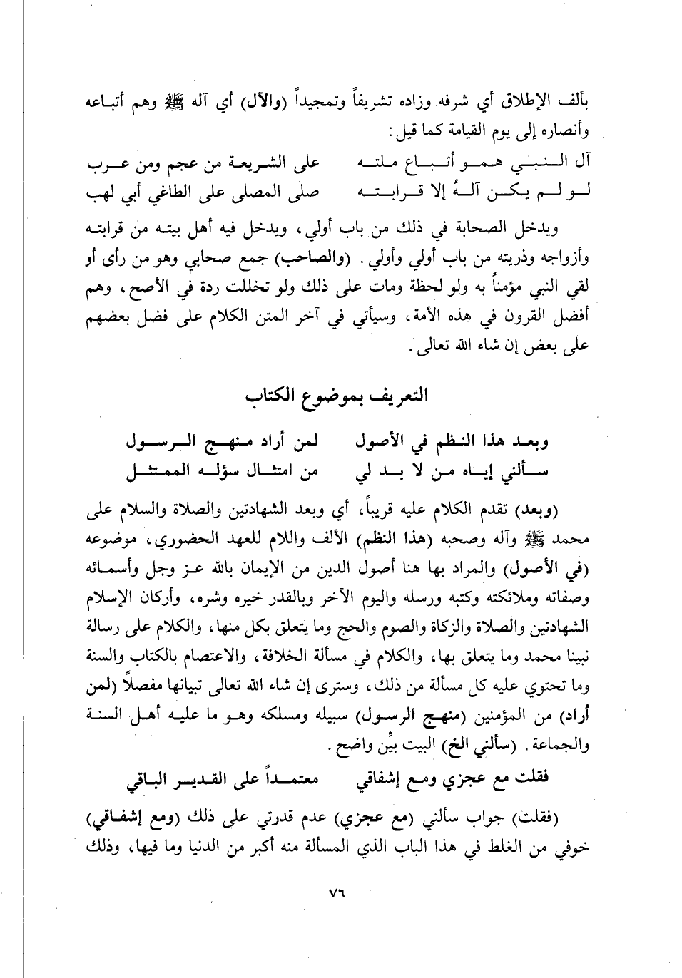 آلُ النَّبِيِّ هُمُو أَتْبَاعُ مِلَّتِهِ ... عَلَى الشَّرِيعَةِ مِنْ عَجَمٍ وَمِنْ عَرَبِ