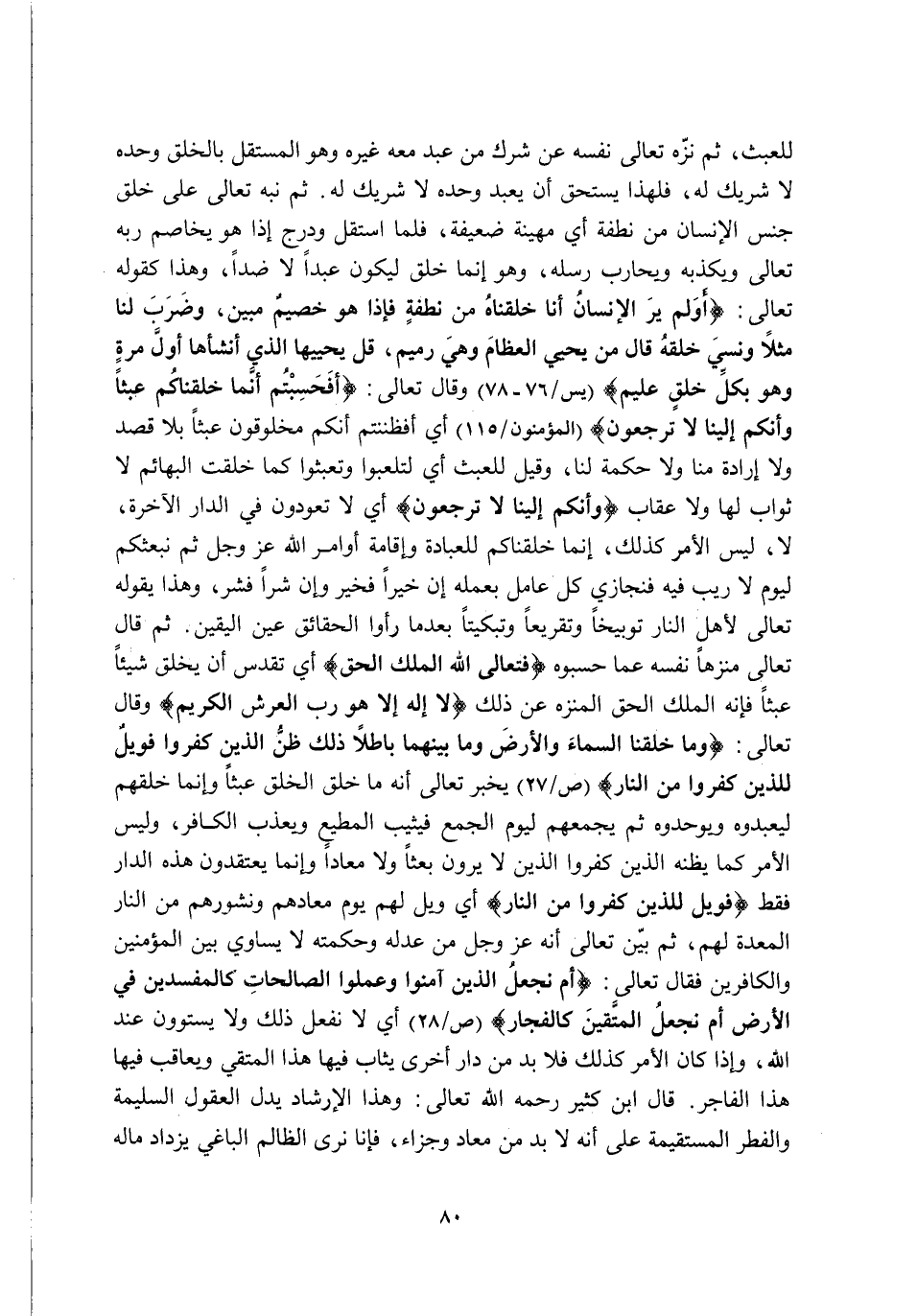 لِلْعَبَثِ ثُمَّ نَزَّهَ تَعَالَى نَفْسَهُ عَنْ شِرْكِ مَنْ عَبَدَ مَعَهُ غَيْرَهُ وَهُوَ الْمُسْتَقِلُّ بِالْخَلْقِ وَحْدَهُ لَا شَرِيكَ لَهُ, فَلِهَذَا يَسْتَحِقُّ أَنْ يُعْبَدَ وَحْدَهُ لَا شَرِيكَ لَهُ ثُمَّ نَبَّهَ تَعَالَى عَلَى خَلْقِ جِنْسِ الْإِنْسَانِ مِنْ نُطْفَةٍ أَيْ: مَهِينَةٍ ضَعِيفَةٍ, فَلَمَّا اسْتَقَلَّ وَدَرَجَ إِذَا هُوَ يُخَاصِمُ رَبَّهُ تَعَالَى وَيُكَذِّبُهُ وَيُحَارِبُ رُسُلَهُ, وَهُوَ إِنَّمَا خُلِقَ لِيَكُونَ عَبْدًا لَا ضِدًّا, وَهَذَا كَقَوْلِهِ تَعَالَى: {أَوَلَمْ يَرَ الْإِنْسَانُ أَنَّا خَلَقْنَاهُ مِنْ نُطْفَةٍ فَإِذَا هُوَ خَصِيمٌ مُبِينٌ، وَضَرَبَ لَنَا مَثَلًا وَنَسِيَ خَلْقَهُ قَالَ مَنْ يُحْيِي الْعِظَامَ وَهِيَ رَمِيمٌ، قُلْ يُحْيِيهَا الَّذِي أَنْشَأَهَا أَوَّلَ مَرَّةٍ وَهُوَ بِكُلِّ خَلْقٍ عَلِيمٌ} [يس: 76-78] وَقَالَ تَعَالَى: {أَفَحَسِبْتُمْ أَنَّمَا خَلَقْنَاكُمْ عَبَثًا وَأَنَّكُمْ إِلَيْنَا لَا تُرْجَعُونَ} [الْمُؤْمِنُونَ: 115] أَيْ: أَفَظَنَنْتُمْ أَنَّكُمْ مَخْلُوقُونَ عَبَثًا بِلَا قَصْدٍ وَلَا إِرَادَةٍ مِنَّا وَلَا حِكْمَةٍ لَنَا, وَقِيلَ لِلْعَبَثِ أَيْ: لِتَلْعَبُوا وَتَعْبَثُوا كَمَا خُلِقَتِ الْبَهَائِمُ لَا ثَوَابَ لَهَا وَلَا عِقَابَ {وَأَنَّكُمْ إِلَيْنَا لَا تُرْجَعُونَ} أَيْ: لَا تَعُودُونَ فِي الدَّارِ الْآخِرَةِ, لَا لَيْسَ الْأَمْرُ كَذَلِكَ إِنَّمَا خَلَقْنَاكُمْ لِلْعِبَادَةِ وَإِقَامَةِ أَوَامِرِ اللَّهِ عَزَّ وَجَلَّ ثُمَّ نَبْعَثُكُمْ لِيَوْمٍ لَا رَيْبَ فِيهِ فَنُجَازِي كُلَّ عَامِلٍ بِعَمَلِهِ إِنْ خَيْرًا فَخَيْرٌ وَإِنْ شَرًّا فَشَرٌّ, وَهَذَا يَقُولُهُ تَعَالَى لِأَهْلِ النَّارِ تَوْبِيخًا وَتَقْرِيعًا وَتَبْكِيتًا بَعْدَمَا رَأَوُا الْحَقَائِقَ عَيْنَ الْيَقِينِ ثُمَّ قَالَ تَعَالَى مُنَزِّهًا نَفْسَهُ عَمَّا حَسِبُوهُ: {فَتَعَالَى اللَّهُ الْمَلِكُ الْحَقُّ} أَيْ: تَقَدَّسَ أَنْ يَخْلُقَ شَيْئًا عَبَثًا فَإِنَّهُ الْمَلِكُ الْحَقُّ الْمُنَزَّهُ عَنْ ذَلِكَ {لَا إِلَهَ إِلَّا هُوَ رَبُّ الْعَرْشِ الْكَرِيمِ} وَقَالَ تَعَالَى: {وَمَا خَلَقْنَا السَّمَاءَ وَالْأَرْضَ وَمَا بَيْنَهُمَا بَاطِلًا ذَلِكَ ظَنُّ الَّذِينَ كَفَرُوا فَوَيْلٌ لِلَّذِينَ كَفَرُوا مِنَ النَّارِ} [ص: 72] يُخْبِرُ تَعَالَى أَنَّهُ مَا خَلَقَ الْخَلْقَ عَبَثًا وَإِنَّمَا خَلَقَهُمْ لِيَعْبُدُوهُ وَيُوَحِّدُوهُ ثُمَّ يَجْمَعُهُمْ لِيَوْمِ الْجَمْعِ فَيُثِيبَ الْمُطِيعَ وَيُعَذِّبَ الْكَافِرَ وَلَيْسَ الْأَمْرُ كَمَا يَظُنُّهُ الَّذِينَ كَفَرُوا الَّذِينَ لَا يَرَوْنَ بَعْثًا وَلَا مَعَادًا وَإِنَّمَا يَعْتَقِدُونَ هَذِهِ الدَّارَ فَقَطْ {فَوَيْلٌ لِلَّذِينَ كَفَرُوا مِنَ النَّارِ} أَيْ: وَيْلٌ لَهُمْ يَوْمَ مَعَادِهِمْ وَنَشُورِهِمْ مِنَ النَّارِ الْمُعَدَّةِ لَهُمْ, ثُمَّ بَيَّنَ تَعَالَى أَنَّهُ عَزَّ وَجَلَّ مِنْ عَدْلِهِ وَحِكْمَتِهِ لَا يُسَاوِي بَيْنَ الْمُؤْمِنِينَ وَالْكَافِرِينَ فَقَالَ تَعَالَى: {أَمْ نَجْعَلُ الَّذِينَ آمَنُوا وَعَمِلُوا الصَّالِحَاتِ كَالْمُفْسِدِينَ فِي الْأَرْضِ أَمْ نَجْعَلُ الْمُتَّقِينَ كَالْفُجَّارِ} [ص: 28] أَيْ: لَا نَفْعَلُ ذَلِكَ وَلَا يَسْتَوُونَ عِنْدَ اللَّهِ, وَإِذَا كَانَ الْأَمْرُ كَذَلِكَ فَلَا بُدَّ مِنْ دَارٍ أُخْرَى يُثَابُ فِيهَا هَذَا الْمُتَّقِي وَيُعَاقَبُ فِيهَا هَذَا الْفَاجِرُ. قَالَ ابْنُ كَثِيرٍ رَحِمَهُ اللَّهُ تَعَالَى: وَهَذَا الْإِرْشَادُ يَدُلُّ الْعُقُولَ السَّلِيمَةَ وَالْفِطَرَ الْمُسْتَقِيمَةَ عَلَى أَنَّهُ لَا بُدَّ مِنْ مَعَادٍ وَجَزَاءٍ, فَإِنَّا نَرَى الظَّالِمَ الْبَاغِيَ يَزْدَادُ مَالُهُ