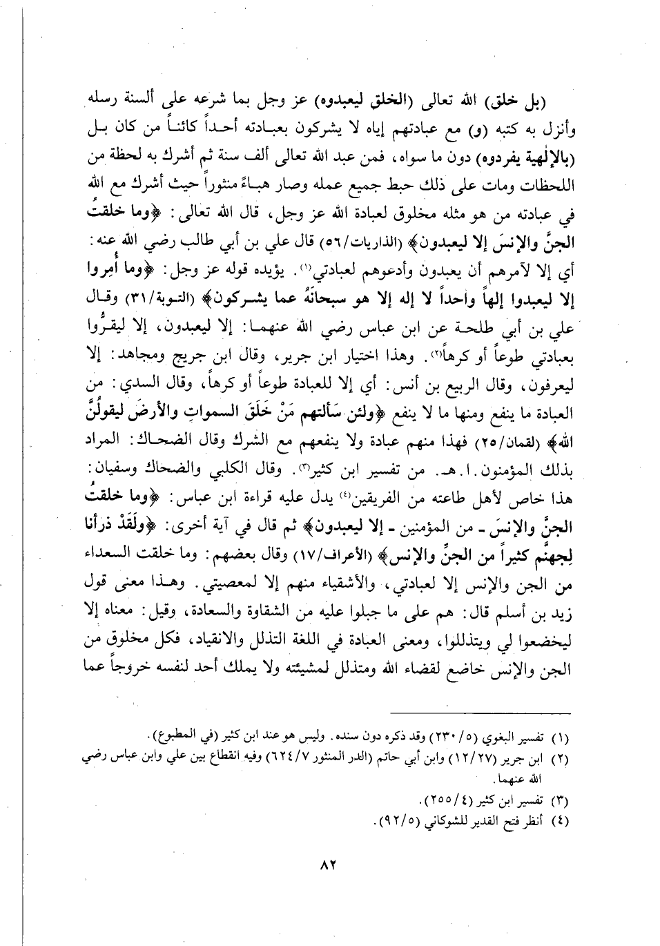 "بَلْ خَلَقَ" اللَّهُ تَعَالَى "الْخَلْقَ لِيَعْبُدُوهُ" عَزَّ وَجَلَّ بِمَا شَرَعَهُ عَلَى أَلْسِنَةِ رُسُلِهِ وَأَنْزَلَ بِهِ كُتُبَهُ "وَ" مَعَ عِبَادَتِهِمْ إِيَّاهُ لَا يُشْرِكُونَ بِعِبَادَتِهِ أَحَدًا كَائِنًا مَنْ كَانَ بَلْ "بِالْإِلَهِيَّةِ يُفْرِدُوهُ" دُونَ مَا سِوَاهُ فَمَنْ عَبَدَ اللَّهَ تَعَالَى أَلْفَ سَنَةٍ ثُمَّ أَشْرَكَ بِهِ لَحْظَةً مِنَ اللَّحَظَاتِ وَمَاتَ عَلَى ذَلِكَ حَبِطَ جَمِيعُ عَمَلِهِ وَصَارَ هَبَاءً مَنْثُورًا حَيْثُ أَشْرَكَ مَعَ اللَّهِ فِي عِبَادَتِهِ مَنْ هُوَ مِثْلُهُ مَخْلُوقٌ لِعِبَادَةِ اللَّهِ عَزَّ وَجَلَّ. قَالَ اللَّهُ تَعَالَى: {وَمَا خَلَقْتُ الْجِنَّ وَالْإِنْسَ إِلَّا لِيَعْبُدُونِ} [الذَّارِيَاتِ: 56] قَالَ عَلِيُّ بْنُ أَبِي طَالِبٍ رَضِيَ اللَّهُ عَنْهُ: أَيْ: إِلَّا لِآمُرَهُمْ أَنْ يَعْبُدُونِ وَأَدْعُوَهُمْ لِعِبَادَتِي1. يُؤَيِّدُهُ قَوْلُهُ عَزَّ وَجَلَّ: {وَمَا أُمِرُوا إِلَّا لِيَعْبُدُوا إِلَهًا وَاحِدًا لَا إِلَهَ إِلَّا هُوَ سُبْحَانَهُ عَمَّا يُشْرِكُونَ} [التَّوْبَةِ: 31] وَقَالَ عَلِيُّ بْنُ أَبِي طَلْحَةَ عَنِ ابْنِ عَبَّاسٍ رَضِيَ اللَّهُ عَنْهُمَا: إِلَّا لِيَعْبُدُونِ إِلَّا لِيُقِرُّوا بِعِبَادَتِي طَوْعًا أَوْ كَرْهًا2. وَهَذَا اخْتِيَارُ ابْنِ جَرِيرٍ, وَقَالَ ابْنُ جُرَيْجٍ وَمُجَاهِدٌ: إِلَّا لِيَعْرِفُونِ, وَقَالَ الرَّبِيعُ بْنُ أَنَسٍ: أَيْ: إِلَّا لِلْعِبَادَةِ طَوْعًا أَوْ كَرْهًا. وَقَالَ السُّدِّيُّ: مِنَ الْعِبَادَةِ مَا يَنْفَعُ وَمِنْهَا مَا لَا يَنْفَعُ. {وَلَئِنْ سَأَلْتَهُمْ مَنْ خَلَقَ السَّمَاوَاتِ وَالْأَرْضَ لَيَقُولُنَّ اللَّهُ} [لُقْمَانَ: 25] فَهَذَا مِنْهُمْ عِبَادَةٌ وَلَا يَنْفَعُهُمْ مَعَ الشِّرْكِ وَقَالَ الضَّحَّاكُ: الْمُرَادُ بِذَلِكَ الْمُؤْمِنُونَ ا. هـ. مِنْ تَفْسِيرِ ابْنِ كَثِيرٍ3. وَقَالَ الْكَلْبِيُّ وَالضَّحَّاكُ وَسُفْيَانُ: هَذَا خَاصٌّ لِأَهْلِ طَاعَتِهِ مِنَ الْفَرِيقَيْنِ4 يَدُلُّ عَلَيْهِ قِرَاءَةُ ابْنِ عَبَّاسٍ: "وَمَا خَلَقْتُ الْجِنَّ وَالْإِنْسَ مِنَ الْمُؤْمِنِينَ إِلَّا لِيَعْبُدُونِ" ثُمَّ قَالَ فِي آيَةٍ أُخْرَى: {وَلَقَدْ ذَرَأْنَا لِجَهَنَّمَ كَثِيرًا مِنَ الْجِنِّ وَالْإِنْسِ} [الْأَعْرَافِ: 17] وَقَالَ بَعْضُهُمْ: وَمَا خَلَقْتُ السُّعَدَاءَ مِنَ الْجِنِّ وَالْإِنْسِ إِلَّا لِعِبَادَتِي وَالْأَشْقِيَاءَ مِنْهُمْ إِلَّا لِمَعْصِيَتِي. وَهَذَا مَعْنَى قَوْلِ زَيْدِ بْنِ أَسْلَمَ قَالَ: هُمْ عَلَى مَا جُبِلُوا عَلَيْهِ مِنَ الشَّقَاوَةِ وَالسَّعَادَةِ وَقِيلَ مَعْنَاهُ إِلَّا لِيَخْضَعُوا لِي وَيَتَذَلَّلُوا. وَمَعْنَى الْعِبَادَةِ فِي اللُّغَةِ التَّذَلُّلُ وَالِانْقِيَادُ فَكُلُّ مَخْلُوقٍ مِنَ الْجِنِّ وَالْإِنْسِ خَاضِعٌ لِقَضَاءِ اللَّهِ وَمُتَذَلِّلٌ لِمَشِيئَتِهِ وَلَا يَمْلِكُ أَحَدٌ لِنَفْسِهِ خُرُوجًا عَمَّا