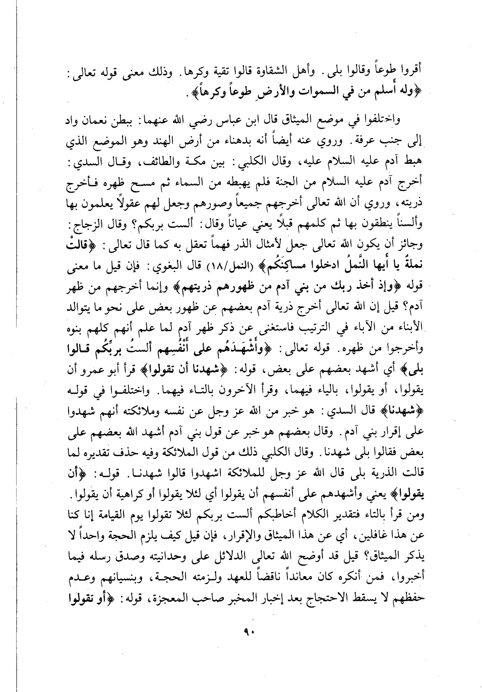 وَاخْتَلَفُوا فِي مَوْضِعِ الْمِيثَاقِ قَالَ ابْنُ عَبَّاسٍ رَضِيَ اللَّهُ عَنْهُمَا: بِبَطْنِ نُعْمَانَ وَادٍ إِلَى جَنْبِ عَرَفَةَ, وَرُوِيَ عَنْهُ أَيْضًا أَنَّهُ بِدَهْنَاءَ مِنْ أَرْضِ الْهِنْدِ وَهُوَ الْمَوْضِعُ الَّذِي هَبَطَ آدَمُ عَلَيْهِ السَّلَامُ عَلَيْهِ. وَقَالَ الْكَلْبِيُّ: بَيْنَ مَكَّةَ وَالطَّائِفِ, وَقَالَ السُّدِّيُّ: أَخْرَجَ آدَمَ عَلَيْهِ السَّلَامُ مِنَ الْجَنَّةِ فَلَمْ يُهْبِطْهُ مِنَ السَّمَاءِ ثُمَّ مَسَحَ ظَهْرَهُ فَأَخْرَجَ ذُرِّيَّتَهُ, وَرُوِيَ أَنَّ اللَّهَ تَعَالَى أَخْرَجَهُمْ جَمِيعًا وَصَوَّرَهُمْ وَجَعَلَ لَهُمْ عُقُولًا يَعْلَمُونَ بِهَا وَأَلْسُنًا يَنْطِقُونَ بِهَا ثُمَّ كَلَّمَهُمْ قُبُلًا يَعْنِي عِيَانًا, وَقَالَ أَلَسْتُ بِرَبِّكُمْ؟ وَقَالَ الزَّجَّاجُ: وَجَائِزٌ أَنْ يَكُونَ اللَّهُ تَعَالَى جَعَلَ لِأَمْثَالِ الذَّرِّ فَهْمًا تَعْقِلُ بِهِ كَمَا قَالَ تَعَالَى: {قَالَتْ نَمْلَةٌ يَا أَيُّهَا النَّمْلُ ادْخُلُوا مَسَاكِنَكُمْ} [النَّمْلِ: 18] قَالَ الْبَغَوِيُّ: فَإِنْ قِيلَ مَا مَعْنَى قَوْلِهِ: {وَإِذْ أَخَذَ رَبُّكَ مِنْ بَنِي آدَمَ مِنْ ظُهُورِهِمْ ذُرِّيَّتَهُمْ} وَإِنَّمَا أَخْرَجَهُمْ مِنْ ظَهْرِ آدَمَ, قِيلَ: إِنَّ اللَّهَ تَعَالَى أَخْرَجَ ذُرِّيَّةَ آدَمَ بَعْضَهُمْ عَنْ ظُهُورِ بَعْضٍ عَلَى نَحْوِ مَا يَتَوَالَدُ الْأَبْنَاءُ مِنَ الْآبَاءِ فِي التَّرْتِيبِ فَاسْتَغْنَى عَنْ ذِكْرِ ظَهْرِ آدَمَ لَمَّا عُلِمَ أَنَّهُمْ كُلَّهُمْ بَنُوهُ وَأُخْرِجُوا مِنْ ظَهْرِهِ. قَوْلُهُ تَعَالَى: {وَأَشْهَدَهُمْ عَلَى أَنْفُسِهِمْ أَلَسْتُ بِرَبِّكُمْ قَالُوا بَلَى} أَيْ: أَشْهَدَ بَعْضَهُمْ عَلَى بَعْضٍ قَوْلُهُ: {شَهِدْنَا أَنْ تَقُولُوا} قَرَأَ أَبُو عَمْرٍو أَنْ يَقُولُوا أَوْ يَقُولُوا بِالْيَاءِ فِيهِمَا, وَقَرَأَ الْآخَرُونَ بِالتَّاءِ فِيهِمَا وَاخْتَلَفُوا فِي قَوْلِهِ {شَهِدْنَا} قَالَ السُّدِّيُّ: هُوَ خَبَرٌ مِنَ اللَّهِ عَزَّ وَجَلَّ عَنْ نَفْسِهِ وَمَلَائِكَتِهِ أَنَّهُمْ شَهِدُوا عَلَى إِقْرَارِ بَنِي آدَمَ. وَقَالَ بَعْضُهُمْ: هُوَ خَبَرٌ عَنْ قَوْلِ بَنِي آدَمَ أَشْهَدَ اللَّهُ بَعْضَهُمْ عَلَى بَعْضٍ فَقَالُوا بَلَى شَهِدْنَا. وَقَالَ الْكَلْبِيُّ: ذَلِكَ مِنْ قَوْلِ الْمَلَائِكَةِ وَفِيهِ حَذْفٌ تَقْدِيرُهُ؛ لَمَّا قَالَتِ الذُّرِّيَّةُ بَلَى قَالَ اللَّهُ عَزَّ وَجَلَّ لِلْمَلَائِكَةِ اشْهَدُوا قَالُوا شَهِدْنَا, قوله: {أَنْ تَقُولُوا} يَعْنِي وَأَشْهَدَهُمْ عَلَى أَنْفُسِهِمْ أَنْ يَقُولُوا أَيْ: لِئَلَّا يَقُولُوا أَوْ كَرَاهِيَةَ أَنْ يَقُولُوا, وَمَنْ قَرَأَ بِالتَّاءِ فَتَقْدِيرُ الْكَلَامِ أُخَاطِبُكُمْ أَلَسْتُ بِرَبِّكُمْ؟ لِئَلَّا تَقُولُوا يَوْمَ الْقِيَامَةِ إِنَّا كُنَّا عَنْ هَذَا غَافِلِينَ أَيْ: عَنْ هَذَا الْمِيثَاقِ وَالْإِقْرَارِ, فَإِنْ قِيلَ كَيْفَ يُلْزِمُ الْحُجَّةَ وَاحِدًا لَا يَذْكُرُ الْمِيثَاقَ؟ قِيلَ قَدْ أَوْضَحَ اللَّهُ تَعَالَى الدَّلَائِلَ عَلَى وَحْدَانِيَّتِهِ وَصِدْقِ رُسُلِهِ فِيمَا أَخْبَرُوا فَمَنْ أَنْكَرَهُ كَانَ مُعَانِدًا نَاقِضًا لِلْعَهْدِ وَلَزِمَتْهُ الْحُجَّةُ, وَبِنِسْيَانِهِمْ وَعَدَمِ حِفْظِهِمْ لَا يَسْقُطُ الِاحْتِجَاجُ بَعْدَ إِخْبَارِ الْمُخْبِرِ صَاحِبِ الْمُعْجِزَةِ قَوْلُهُ: {أَوْ تَقُولُوا