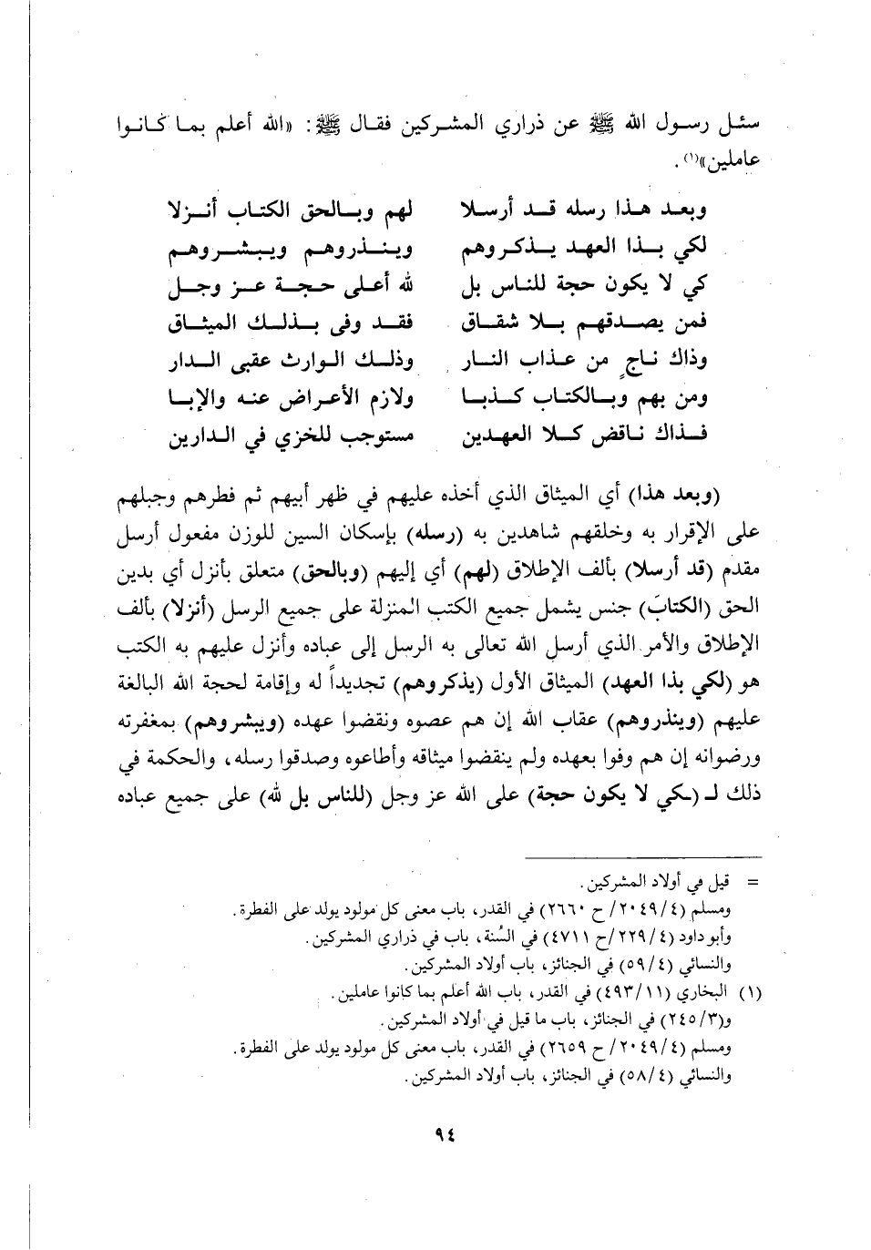 "وَبَعْدَ هَذَا" أَيِ: الْمِيثَاقِ الَّذِي أَخَذَهُ عَلَيْهِمْ فِي ظَهْرِ أَبِيهِمْ ثُمَّ فَطَرَهُمْ وَجَبَلَهُمْ عَلَى الْإِقْرَارِ بِهِ وَخَلَقَهُمْ شَاهِدِينَ بِهِ "رُسْلَهُ" بِإِسْكَانِ السِّينِ لِلْوَزْنِ مَفْعُولُ أَرْسَلَ مُقَدَّمٌ "قَدْ أَرْسَلَا" بِأَلْفِ الْإِطْلَاقِ "لَهُمْ" أَيْ: إِلَيْهِمْ "وَبِالْحَقِّ" مُتَعَلِّقٌ بِأَنْزَلَ أَيْ: بِدِينِ الْحَقِّ "الْكِتَابَ" جِنْسٌ يَشْمَلُ جَمِيعَ الْكُتُبِ الْمُنَزَّلَةِ عَلَى جَمِيعِ الرُّسُلِ "أَنْزَلَا" بِأَلْفِ الْإِطْلَاقِ وَالْأَمْرُ الَّذِي أَرْسَلَ اللَّهُ تَعَالَى بِهِ الرُّسُلَ إِلَى عِبَادِهِ وَأَنْزَلَ عَلَيْهِمْ بِهِ الْكُتُبَ هُوَ "لِكَيْ بِذَا الْعَهْدِ" الْمِيثَاقِ الْأَوَّلِ "يُذَكِّرُوهُمْ" تَجْدِيدًا لَهُ وَإِقَامَةً لِحُجَّةِ اللَّهِ الْبَالِغَةِ عَلَيْهِمْ "وَيُنْذِرُوهُمْ" عِقَابَ اللَّهِ إِنْ هُمْ عَصَوْهُ وَنَقَضُوا عَهْدَهُ "وَيُبَشِّرُوهُمْ" بِمَغْفِرَتِهِ وَرِضْوَانِهِ إِنْ هُمْ وَفَّوْا بِعَهْدِهِ وَلَمْ يَنْقُضُوا مِيثَاقَهُ وَأَطَاعُوهُ وَصَدَّقُوا رُسُلَهُ, وَالْحِكْمَةُ فِي ذَلِكَ لِـ"كَيْ لَا يَكُونَ حُجَّةٌ" عَلَى اللَّهِ عَزَّ وَجَلَّ "لِلنَّاسِ بَلْ لِلَّهِ" عَلَى جَمِيعِ عِبَادِهِ