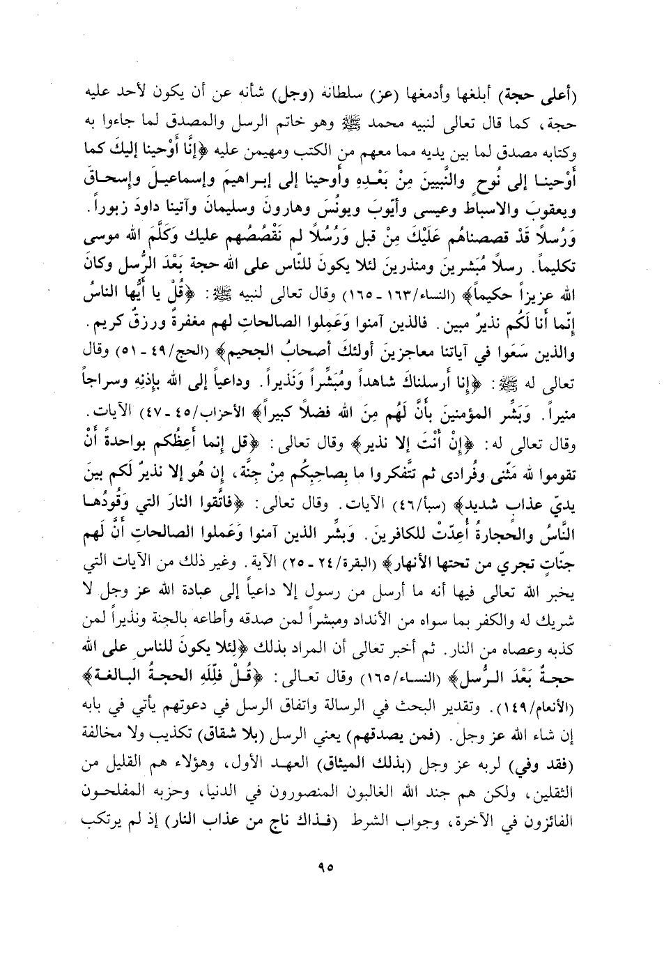 "أَعْلَى حُجَّةٍ" أَبْلَغُهَا وَأَدْمَغُهَا "عَزَّ" سُلْطَانُهُ "وَجَلَّ" شَأْنُهُ عَنْ أَنْ يَكُونَ لِأَحَدٍ عَلَيْهِ حُجَّةٌ كَمَا قَالَ تَعَالَى لِنَبِيِّهِ مُحَمَّدٍ -صَلَّى اللَّهُ عَلَيْهِ وَسَلَّمَ- وَهُوَ خَاتَمُ الرُّسُلِ وَالْمُصَدِّقُ لِمَا جَاءُوا بِهِ وَكِتَابُهُ مُصَدِّقٌ لِمَا بَيْنَ يَدَيْهِ مِمَّا مَعَهُمْ مِنَ الْكُتُبِ وَمُهَيْمِنٌ عَلَيْهِ {إِنَّا أَوْحَيْنَا إِلَيْكَ كَمَا أَوْحَيْنَا إِلَى نُوحٍ وَالنَّبِيِّينَ مِنْ بَعْدِهِ وَأَوْحَيْنَا إِلَى إِبْرَاهِيمَ وَإِسْمَاعِيلَ وَإِسْحَاقَ وَيَعْقُوبَ وَالْأَسْبَاطِ وَعِيسَى وَأَيُّوبَ وَيُونُسَ وَهَارُونَ وَسُلَيْمَانَ وَآتَيْنَا دَاوُدَ زَبُورًا، وَرُسُلًا قَدْ قَصَصْنَاهُمْ عَلَيْكَ مِنْ قَبْلُ وَرُسُلًا لَمْ نَقْصُصْهُمْ عَلَيْكَ وَكَلَّمَ اللَّهُ مُوسَى تَكْلِيمًا، رُسُلًا مُبَشِّرِينَ وَمُنْذِرِينَ لِئَلَّا يَكُونَ لِلنَّاسِ عَلَى اللَّهِ حُجَّةٌ بَعْدَ الرُّسُلِ وَكَانَ اللَّهُ عَزِيزًا حَكِيمًا} [النِّسَاءِ: 136-165] وَقَالَ تَعَالَى لِنَبِيِّهِ, صَلَّى اللَّهُ عَلَيْهِ وَسَلَّمَ: {قُلْ يَا أَيُّهَا النَّاسُ إِنَّمَا أَنَا لَكُمْ نَذِيرٌ مُبِينٌ، فَالَّذِينَ آمَنُوا وَعَمِلُوا الصَّالِحَاتِ لَهُمْ مَغْفِرَةٌ وَرِزْقٌ كَرِيمٌ، وَالَّذِينَ سَعَوْا فِي آيَاتِنَا مُعَاجِزِينَ أُولَئِكَ أَصْحَابُ الْجَحِيمِ} [الْحَجِّ: 49-51] وَقَالَ تَعَالَى لَهُ صَلَّى اللَّهُ عَلَيْهِ وَسَلَّمَ: {إِنَّا أَرْسَلْنَاكَ شَاهِدًا وَمُبَشِّرًا وَنَذِيرًا، وَدَاعِيًا إِلَى اللَّهِ بِإِذْنِهِ وَسِرَاجًا مُنِيرًا، وَبَشِّرِ الْمُؤْمِنِينَ بِأَنَّ لَهُمْ مِنَ اللَّهِ فَضْلًا كَبِيرًا} [الْأَحْزَابِ: 45-47] الْآيَاتِ. وَقَالَ تَعَالَى لَهُ: {إِنْ أَنْتَ إِلَّا نَذِيرٌ} وَقَالَ تَعَالَى: {قُلْ إِنَّمَا أَعِظُكُمْ بِوَاحِدَةٍ أَنْ تَقُومُوا لِلَّهِ مَثْنَى وَفُرَادَى ثُمَّ تَتَفَكَّرُوا مَا بِصَاحِبِكُمْ مِنْ جِنَّةٍ إِنْ هُوَ إِلَّا نَذِيرٌ لَكُمْ بَيْنَ يَدَيْ عَذَابٍ شَدِيدٍ} [سَبَأٍ: 46] الْآيَاتِ. وَقَالَ تَعَالَى: {فَاتَّقُوا النَّارَ الَّتِي وَقُودُهَا النَّاسُ وَالْحِجَارَةُ أُعِدَّتْ لِلْكَافِرِينَ، وَبَشِّرِ الَّذِينَ آمَنُوا وَعَمِلُوا الصَّالِحَاتِ أَنَّ لَهُمْ جَنَّاتٍ تَجْرِي مِنْ تَحْتِهَا الْأَنْهَارُ} [الْبَقَرَةِ: 24-25] الْآيَةَ. وَغَيْرَ ذَلِكَ مِنَ الْآيَاتِ الَّتِي يُخْبِرُ اللَّهُ تَعَالَى فِيهَا أَنَّهُ مَا أَرْسَلَ مِنْ رَسُولٍ إِلَّا دَاعِيًا إِلَى عِبَادَةِ اللَّهِ عَزَّ وَجَلَّ لَا شَرِيكَ لَهُ وَالْكُفْرِ بِمَا سِوَاهُ مِنَ الْأَنْدَادِ وَمُبَشِّرًا لِمَنْ صَدَّقَهُ وَأَطَاعَهُ بِالْجَنَّةِ وَنَذِيرًا لِمَنْ كَذَّبَهُ وَعَصَاهُ مِنَ النَّارِ. ثُمَّ أَخْبَرَ تَعَالَى أَنَّ الْمُرَادَ بِذَلِكَ {لِئَلَّا يَكُونَ لِلنَّاسِ عَلَى اللَّهِ حُجَّةٌ بَعْدَ الرُّسُلِ} [النِّسَاءِ: 165] وَقَالَ تَعَالَى: {قُلْ فَلِلَّهِ الْحُجَّةُ الْبَالِغَةُ} [الْأَنْعَامِ: 149] وَتَقْدِيرُ الْبَحْثِ فِي الرِّسَالَةِ وَاتِّفَاقِ الرُّسُلِ فِي دَعْوَتِهِمْ يَأْتِي فِي بَابِهِ إِنْ شَاءَ اللَّهُ عَزَّ وَجَلَّ "فَمَنْ يُصَدِّقْهُمْ" يَعْنِي الرُّسُلَ "بِلَا شِقَاقِ" تَكْذِيبٍ وَلَا مُخَالَفَةٍ "فَقَدْ وَفَى" لِرَبِّهِ عَزَّ وَجَلَّ "بِذَلِكَ الْمِيثَاقِ" الْعَهْدِ الْأَوَّلِ, وَهَؤُلَاءِ هُمُ الْقَلِيلُ مِنَ الثَّقَلَيْنِ, وَلَكِنْ هُمْ جُنْدُ اللَّهِ الْغَالِبُونَ الْمَنْصُورُونَ فِي الدُّنْيَا وَحِزْبُهُ الْمُفْلِحُونَ الْفَائِزُونَ فِي الْآخِرَةِ وَجَوَابُ الشَّرْطِ "فَذَاكَ نَاجٍ مِنْ عَذَابِ النَّارِ" إِذْ لَمْ يَرْتَكِبْ