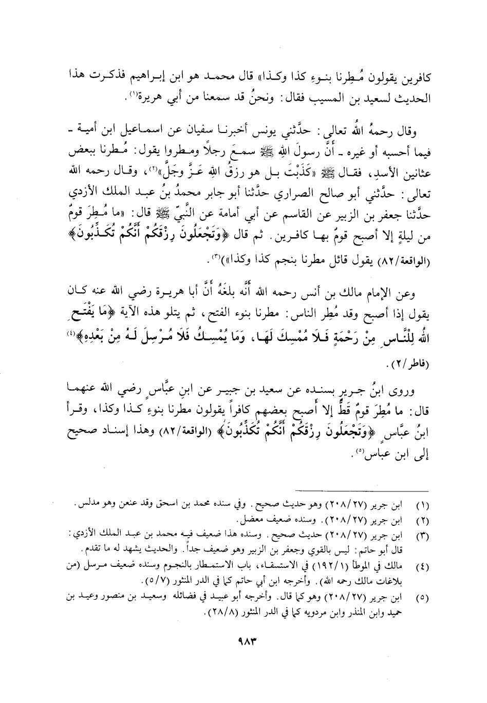 وَرَوَى ابْنُ جَرِيرٍ بِسَنَدِهِ عَنْ سَعِيدِ بْنِ جُبَيْرٍ عَنِ ابْنِ عَبَّاسٍ رَضِيَ اللَّهُ عَنْهُمَا قَالَ: مَا مُطِرَ قَوْمٌ قَطُّ إِلَّا أَصْبَحَ بَعْضُهُمْ كَافِرًا يَقُولُونَ مُطِرْنَا بِنَوْءِ كَذَا وَكَذَا. وَقَرَأَ ابْنُ عَبَّاسٍ {وَتَجْعَلُونَ رِزْقَكُمْ أَنَّكُمْ تُكَذِّبُونَ} [الْوَاقِعَةِ: 82] وَهَذَا إِسْنَادٌ صَحِيحٌ إِلَى ابْنِ عَبَّاسٍ5.