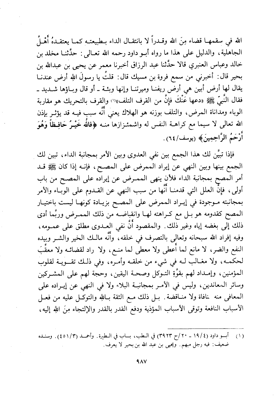 اللَّهِ فِي سِقَمِهَا قَضَاءً مِنَ اللَّهِ وَقَدَرًا لَا بِانْتِقَالِ الدَّاءِ بِطَبِيعَتِهِ كَمَا يَعْتَقِدُهُ أَهْلُ الْجَاهِلِيَّةِ, وَالدَّلِيلُ عَلَى هَذَا مَا رَوَاهُ أَبُو دَاوُدَ رَحِمَهُ اللَّهُ تَعَالَى: حَدَّثَنَا مَخْلَدُ بْنُ خَالِدٍ وَعَبَّاسُ الْعَنْبَرِيُّ قَالَا: حَدَّثَنَا عَبْدُ الرَّزَّاقِ أَخْبَرَنَا مَعْمَرٌ عَنْ يَحْيَى بْنُ عَبْدِ اللَّهِ بْنِ بَحِيرٍ قَالَ: أَخْبَرَنِي مَنْ سَمِعَ فَرْوَةَ بْنَ مُسَيْكٍ قَالَ: قُلْتُ: يَا رَسُولَ اللَّهِ أَرْضٌ عِنْدَنَا يُقَالُ لَهَا أَرْضُ أَبْيَنَ هِيَ أَرْضُ رِيفِنَا وَمِيرَتِنَا وَإِنَّهَا وَبِئَةٌ -أَوْ قَالَ وَبَاؤُهَا شَدِيدٌ- فَقَالَ النَّبِيُّ, صَلَّى اللَّهُ عَلَيْهِ وَسَلَّمَ: "دَعْهَا عَنْكَ فَإِنَّ مِنَ الْقَرَفِ التَّلَفَ" 1 وَالْقَرَفُ بِالتَّحْرِيكِ هُوَ مُقَارَبَةُ الْوَبَاءِ وَمُدَانَاةُ الْمَرَضِ, وَالتَّلَفُ بِوَزْنِهِ هُوَ الْهَلَاكُ, يَعْنِي أَنَّهُ سَبَبٌ فِيهِ قَدْ يُؤَثِّرُ بِإِذْنِ اللَّهِ تَعَالَى لَا سِيَّمَا مَعَ كَرَاهَةِ النَّفْسِ لَهُ وَاشْمِئْزَازِهَا مِنْهُ {فَاللَّهُ خَيْرٌ حَافِظًا وَهُوَ أَرْحَمُ الرَّاحِمِينَ} [يُوسُفَ: 64] .