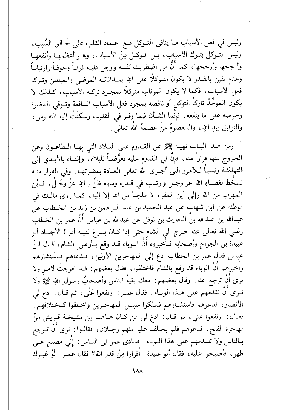وَمِنْ هَذَا الْبَابِ نَهْيُهُ -صَلَّى اللَّهُ عَلَيْهِ وَسَلَّمَ- عَنِ الْقُدُومِ عَلَى الْبِلَادِ الَّتِي بِهَا الطَّاعُونُ وَعَنِ الْخُرُوجِ مِنْهَا فِرَارًا مِنْهُ فَإِنَّ فِي الْقُدُومِ عَلَيْهِ تَعَرُّضًا لِلْبَلَاءِ, وَإِلْقَاءً بِالْأَيْدِي إِلَى التَّهْلُكَةِ وَتَسَبُّبًا لِلْأُمُورِ الَّتِي أَجْرَى اللَّهُ تَعَالَى الْعَادَةَ بِمَضَرَّتِهَا. وَفِي الفرار منه تسخط لِقَضَاءِ اللَّهِ عز وجل وارتياب فِي قَدَرِهِ وَسُوءَ ظَنٍّ بِاللَّهِ عَزَّ وَجَلَّ, فَأَيْنَ الْمَهْرَبُ مِنَ اللَّهِ وَإِلَى أَيْنَ الْمَفَرُّ, لَا مَلْجَأَ مِنَ اللَّهِ إِلَّا إِلَيْهِ كَمَا رَوَى مَالِكٌ فِي مُوَطَّئِهِ عَنِ ابْنِ شِهَابٍ عَنْ عَبْدِ الْحَمِيدِ بْنِ عَبْدِ الرَّحْمَنِ بْنِ زَيْدِ بْنِ الْخَطَّابِ عَنْ عَبْدِ اللَّهِ بْنِ عَبْدِ اللَّهِ بْنِ الْحَارِثِ بْنِ نَوْفَلٍ عَنْ عَبْدِ اللَّهِ بْنِ عَبَّاسٍ أَنَّ عُمَرَ بْنَ الْخَطَّابِ رَضِيَ اللَّهُ عَنْهُ خَرَجَ إِلَى الشَّامِ حَتَّى إِذَا كَانَ بِسَرْغَ لَقِيَهُ أُمَرَاءُ الْأَجْنَادِ أَبُو عُبَيْدَةَ بْنُ الْجَرَّاحِ وَأَصْحَابُهُ فَأَخْبَرُوهُ أَنَّ الْوَبَاءَ قَدْ وَقَعَ بِأَرْضِ الشَّامِ, قَالَ ابْنُ عَبَّاسٍ: فَقَالَ عُمَرُ بن الخطاب: ادع إلى الْمُهَاجِرِينَ الْأَوَّلِينَ, فَدَعَاهُمْ فَاسْتَشَارَهُمْ وَأَخْبَرَهُمْ أَنَّ الْوَبَاءَ قَدْ وَقَعَ بِالشَّامِ فَاخْتَلَفُوا, فَقَالَ بَعْضُهُمْ: قَدْ خَرَجْتَ لِأَمْرٍ وَلَا نَرَى أَنْ تَرْجِعَ عَنْهُ. وَقَالَ بَعْضُهُمْ: مَعَكَ بَقِيَّةُ النَّاسِ وَأَصْحَابُ رَسُولِ اللَّهِ -صَلَّى اللَّهُ عَلَيْهِ وَسَلَّمَ- وَلَا نَرَى أَنْ تُقْدِمَهُمْ عَلَى هَذَا الْوَبَاءِ. فَقَالَ عُمَرُ: ارْتَفِعُوا عَنِّي ثُمَّ قَالَ: ادْعُ لي الأنصار فدعاهم فَاسْتَشَارَهُمْ فَسَلَكُوا سَبِيلَ الْمُهَاجِرِينَ وَاخْتَلَفُوا كَاخْتِلَافِهِمْ فَقَالَ: ارْتَفِعُوا عَنِّي ثُمَّ قَالَ: ادْعُ لِي من كان ههنا مَنْ مَشْيَخَةِ قُرَيْشٍ مِنْ مهاجرة الفتح, فدعوهم فَلَمْ يَخْتَلِفْ عَلَيْهِ مِنْهُمْ رَجُلَانِ فَقَالُوا: نَرَى أَنْ تَرْجِعَ بِالنَّاسِ وَلَا تُقْدِمَهُمْ عَلَى هَذَا الْوَبَاءِ فَنَادَى عُمَرُ فِي النَّاسِ: إِنِّي مُصْبِحٌ عَلَى ظَهْرٍ, فأصبحوا عليه, فقال أَبُو عُبَيْدَةَ: أَفِرَارًا مِنْ قَدَرِ اللَّهِ؟ فَقَالَ عُمَرُ: لَوْ غَيْرُكَ