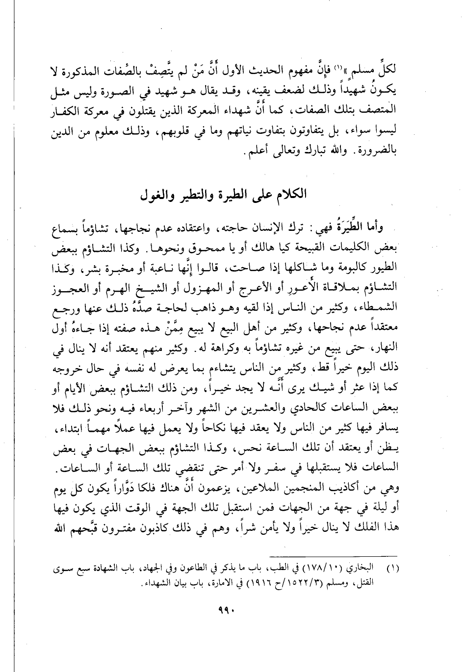 لِكُلِّ مُسْلِمٍ" 1 فَإِنَّ مَفْهُومَ الْحَدِيثِ الْأَوَّلِ أَنَّ مَنْ لَمْ يَتَّصِفْ بِالصِّفَاتِ الْمَذْكُورَةِ لَا يَكُونُ شَهِيدًا وَذَلِكَ لِضَعْفِ يَقِينِهِ, وَقَدْ يُقَالُ هُوَ شَهِيدٌ فِي الصُّورَةِ وَلَيْسَ مِثْلَ الْمُتَّصِفِ بِتِلْكَ الصِّفَاتِ, كَمَا أَنَّ شُهَدَاءَ الْمَعْرَكَةِ الَّذِينَ يُقْتَلُونَ فِي مَعْرَكَةِ الْكُفَّارِ لَيْسُوا سَوَاءً؛ بَلْ يَتَفَاوَتُونَ بِتَفَاوُتِ نِيَّاتِهِمْ وَمَا فِي قُلُوبِهِمْ, وَذَلِكَ مَعْلُومٌ مِنَ الدِّينِ بِالضَّرُورَةِ. وَاللَّهُ تَبَارَكَ وَتَعَالَى أَعْلَمُ.