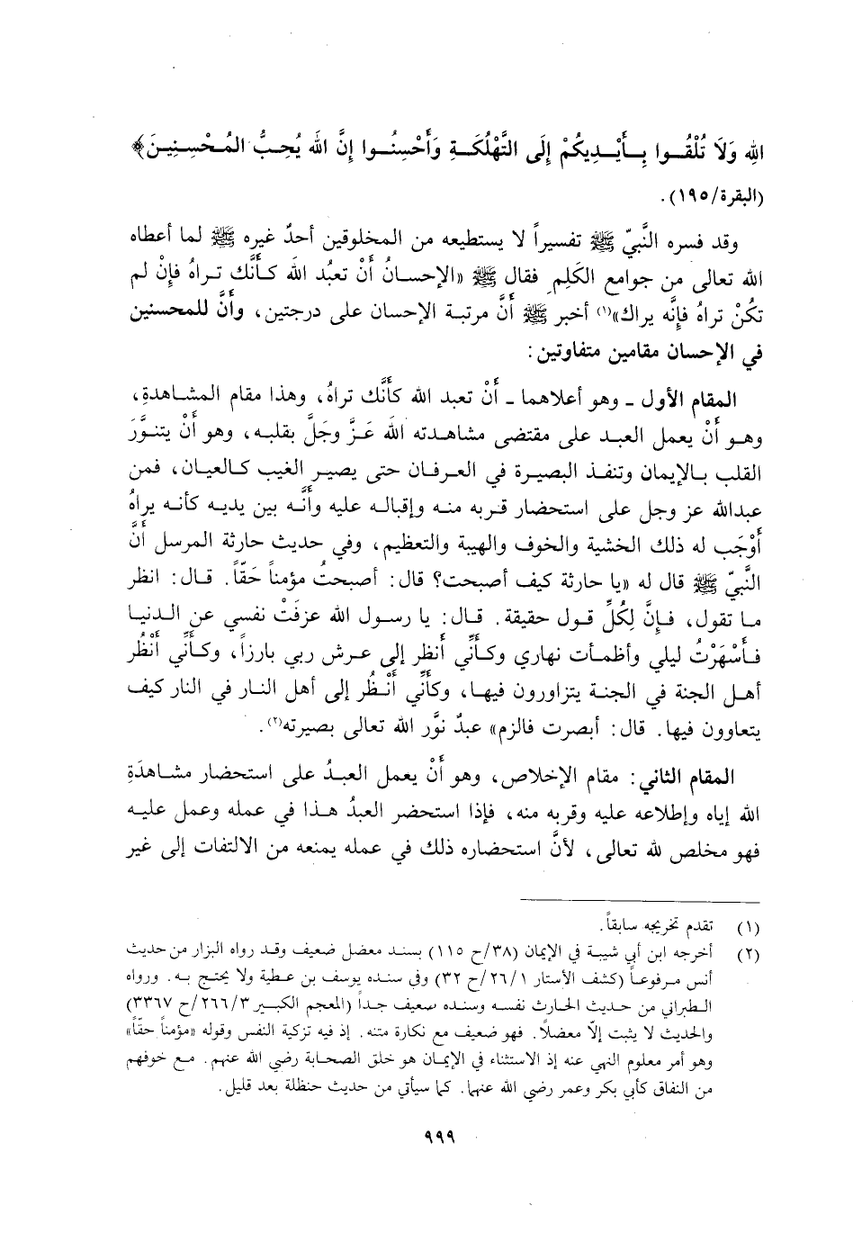 وَقَدْ فَسَّرَهُ النَّبِيُّ -صَلَّى اللَّهُ عَلَيْهِ وَسَلَّمَ- تَفْسِيرًا لَا يَسْتَطِيعُهُ مِنَ الْمَخْلُوقِينَ أَحَدٌ غَيْرَهُ -صَلَّى اللَّهُ عَلَيْهِ وَسَلَّمَ- لِمَا أَعْطَاهُ اللَّهُ تَعَالَى مِنْ جَوَامِعِ الْكَلِمِ فَقَالَ, صَلَّى اللَّهُ عَلَيْهِ وَسَلَّمَ: "الْإِحْسَانُ أَنْ تَعْبُدَ اللَّهَ كَأَنَّكَ تَرَاهُ فَإِنْ لَمْ تَكُنْ تَرَاهُ فَإِنَّهُ يَرَاكَ" 1 أَخْبَرَ -صَلَّى اللَّهُ عَلَيْهِ وَسَلَّمَ- أَنَّ مَرْتَبَةَ الْإِحْسَانِ عَلَى دَرَجَتَيْنِ, وَأَنَّ لِلْمُحْسِنِينَ فِي الْإِحْسَانِ مَقَامَيْنِ مُتَفَاوِتَيْنِ: