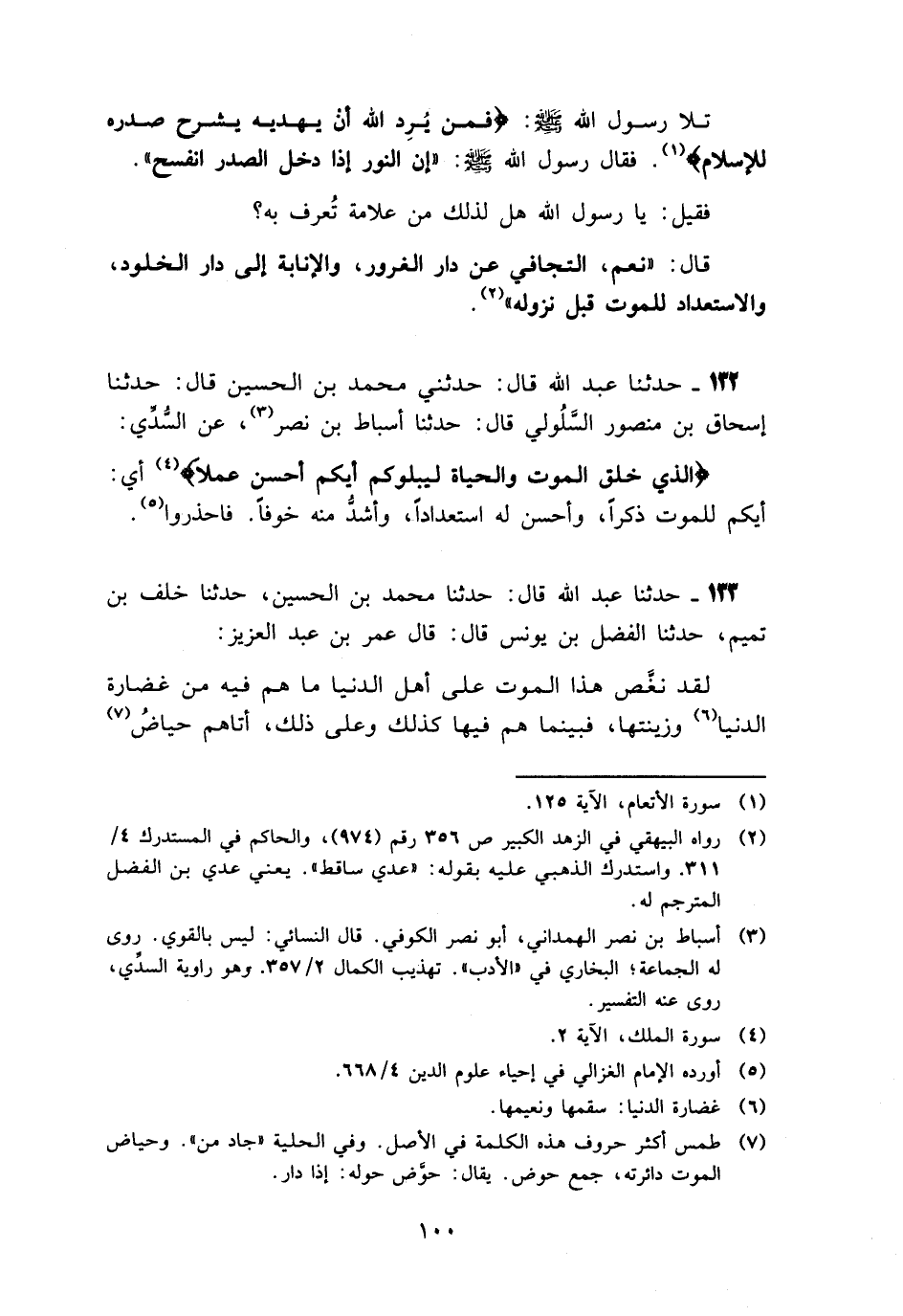 132 - حَدَّثَنَا عَبْدُ اللَّهِ قَالَ: حَدَّثَنِي مُحَمَّدُ بْنُ الْحُسَيْنِ، قَالَ: حَدَّثَنَا إِسْحَاقُ بْنُ مَنْصُورٍ السَّلُولِيُّ، قَالَ: حَدَّثَنَا أَسْبَاطُ بْنُ نَصْرٍ، عَنِ السُّدِّيِّ: {الَّذِي خَلَقَ الْمَوْتَ وَالْحَيَاةَ لِيَبْلُوَكُمْ أَيُّكُمْ أَحْسَنُ عَمَلًا} [الملك: 2] " أَيْ: §أَيُّكُمْ لِلْمَوْتِ ذِكْرًا، وَأَحْسَنُ لَهُ اسْتِعْدَادًا، وَأَشَدُّ مِنْهُ خَوْفًا، فَاحْذَرُوا "
