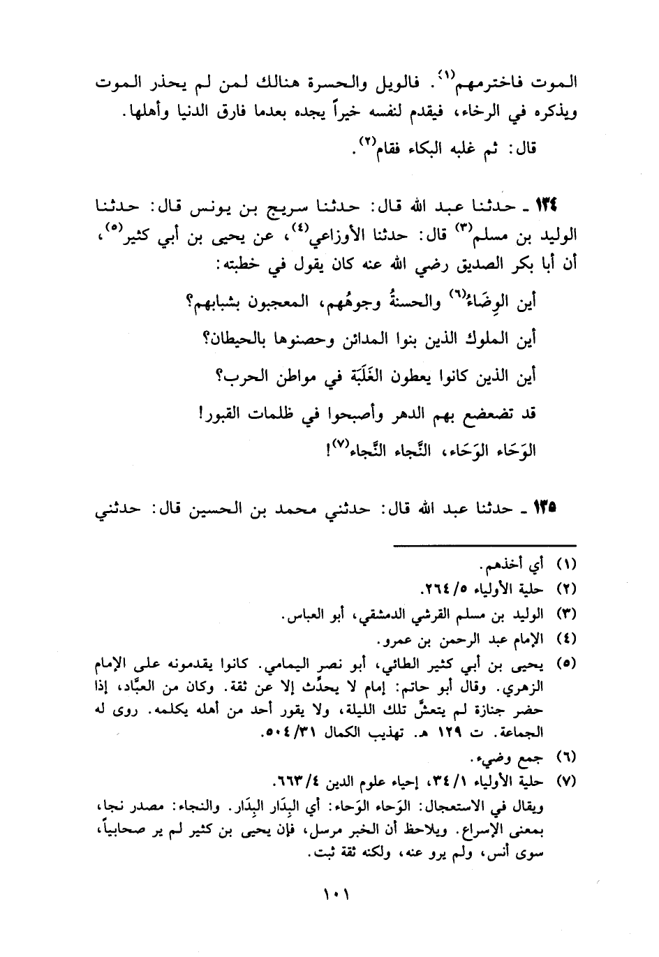 134 - حَدَّثَنَا عَبْدُ اللَّهِ قَالَ: حَدَّثَنَا سُرَيْجُ بْنُ يُونُسَ، قَالَ: حَدَّثَنَا الْوَلِيدُ بْنُ مُسْلِمٍ، قَالَ: حَدَّثَنَا الْأَوْزَاعِيُّ، عَنْ يَحْيَى بْنِ أَبِي كَثِيرٍ، أَنَّ أَبَا بَكْرٍ الصِّدِّيقَ رَضِيَ اللَّهُ عَنْهُ كَانَ يَقُولُ فِي خُطْبَتِهِ: «§أَيْنَ الْوِضَاءُ وَالْحَسَنَةُ وُجُوهُهُمْ، الْمُعْجَبُونَ بِشَبَابِهِمْ؟ أَيْنَ الْمُلُوكُ الَّذِينَ بَنَوُا الْمَدَائِنَ وَحَصَّنُوهَا بِالْحِيطَانِ؟ أَيْنَ الَّذِينَ كَانُوا يُعْطَوْنَ الْغَلَبَةَ فِي مَوَاطِنِ الْحَرْبِ؟ قَدْ تَضَعْضَعَ بِهِمُ الدَّهْرُ وَأَصْبَحُوا فِي ظُلُمَاتِ الْقُبُورِ الْوَحَاءَ الْوَحَاءَ، النَّجَاءَ النَّجَاءَ»