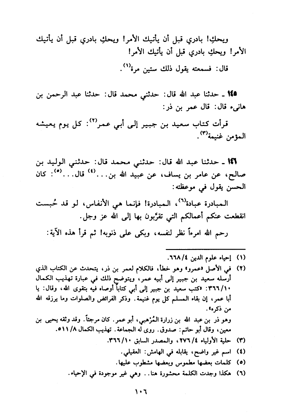 145 - حَدَّثَنَا عَبْدُ اللَّهِ قَالَ: حَدَّثَنِي مُحَمَّدٌ، قَالَ: حَدَّثَنَا عَبْدُ الرَّحْمَنِ بْنُ هَانِئٍ، قَالَ: قَالَ عُمَرُ بْنُ ذَرٍّ: قَرَأْتُ كِتَابَ سَعِيدِ بْنِ جُبَيْرٍ إِلَى أَبِي عُمَرَ: «§كُلُّ يَوْمٍ يَعِيشُهُ الْمُؤْمِنُ غَنِيمَةٌ»
