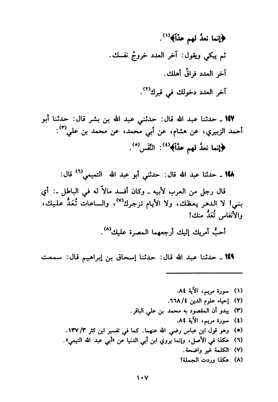 147 - حَدَّثَنَا عَبْدُ اللَّهِ قَالَ: حَدَّثَنِي عَبْدُ اللَّهِ بْنُ بِشْرٍ، قَالَ: حَدَّثَنَا أَبُو أَحْمَدَ الزُّبَيْرِيُّ، عَنْ هِشَامٍ، عَنْ أَبِي مُحَمَّدٍ، عَنْ مُحَمَّدِ بْنِ عَلِيٍّ: {§إِنَّمَا نَعُدُّ لَهُمْ عَدًّا} [مريم: 84] : «النَّفَسُ»