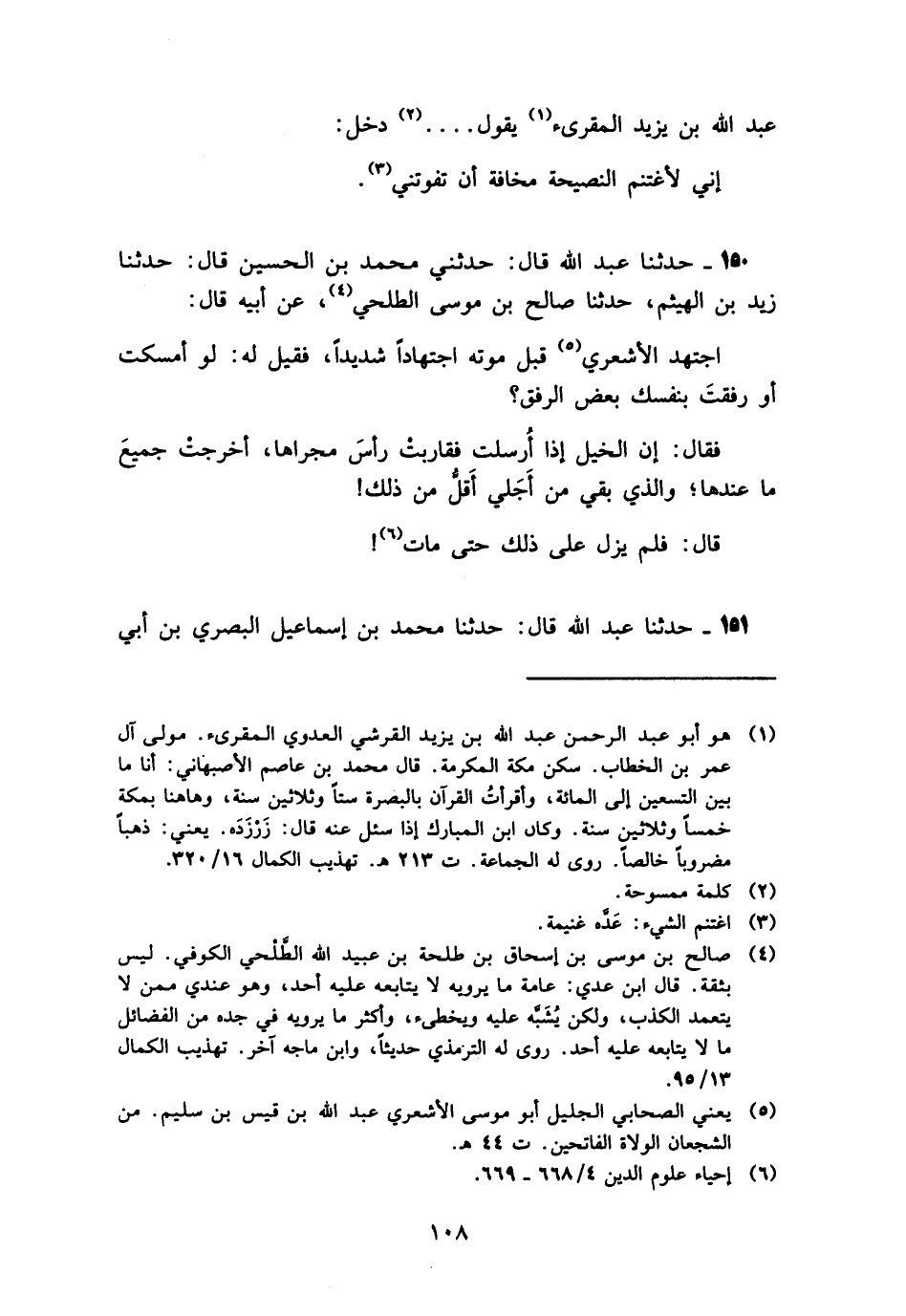 150 - حَدَّثَنَا عَبْدُ اللَّهِ قَالَ: حَدَّثَنِي مُحَمَّدُ بْنُ الْحُسَيْنِ، قَالَ: حَدَّثَنَا زَيْدُ بْنُ الْهَيْثَمِ، حَدَّثَنَا صَالِحُ بْنُ مُوسَى الطَّلْحِيُّ، عَنْ أَبِيهِ، قَالَ: اجْتَهَدَ الْأَشْعَرِيُّ قَبْلَ مَوْتِهِ اجْتِهَادًا شَدِيدًا، فَقِيلَ لَهُ: لَوْ أَمْسَكَتَ أَوْ رَفَقْتَ بِنَفْسِكَ بَعْضَ الرِّفْقِ؟ فَقَالَ: «§إِنَّ الْخَيْلَ إِذَا أُرْسِلَتْ فَقَارَبَتْ رَأْسَ مُجْرَاهَا، أَخْرَجَتْ جَمِيعَ مَا عِنْدَهَا، وَالَّذِي بَقِيَ مِنْ أَجْلِي أَقَلُّ مِنْ ذَلِكَ» . قَالَ: فَلَمْ يَزَلْ عَلَى ذَلِكَ حَتَّى مَاتَ