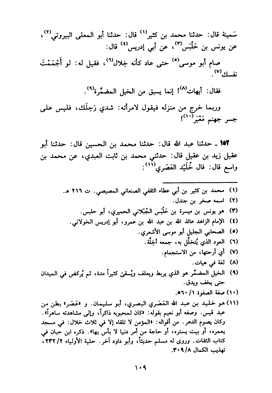 152 - حَدَّثَنَا عَبْدُ اللَّهِ قَالَ: حَدَّثَنَا مُحَمَّدُ بْنُ الْحُسَيْنِ، قَالَ: حَدَّثَنَا أَبُو عَقِيلٍ زَيْدُ بْنُ عَقِيلٍ قَالَ: حَدَّثَنِي مُحَمَّدُ بْنُ ثَابِتٍ الْعَبْدِيُّ، عَنْ مُحَمَّدِ بْنِ وَاسِعٍ، قَالَ: قَالَ خُلَيْدٌ الْعَصَرِيُّ -[110]-: «§كُلُّنَا قَدْ أَيْقَنَ بِالْمَوْتِ، وَمَا نَرَى لَهُ مُسْتَعِدًّا , وَكُلُّنَا قَدْ أَيْقَنَ بِالْجَنَّةِ، وَمَا نَرَى لَهَا عَامِلًا , وَكُلُّنَا قَدْ أَيْقَنَ بِالنَّارِ، وَمَا نَرَى لَهَا خَائِفًا , فَعَلَامَ تُعَرِّجُونَ؟ وَمَا عَسَيْتُمْ تَنْتَظِرُونَ الْمَوْتَ؟، فَهُوَ أَوَّلُ وَارِدٍ عَلَيْكُمْ مِنَ اللَّهِ، بِخَيْرٍ أَوْ بِشَرٍّ، يَا إِخْوَتَاهْ سِيرُوا إِلَى رَبِّكُمْ سَيْرًا جَمِيلًا»