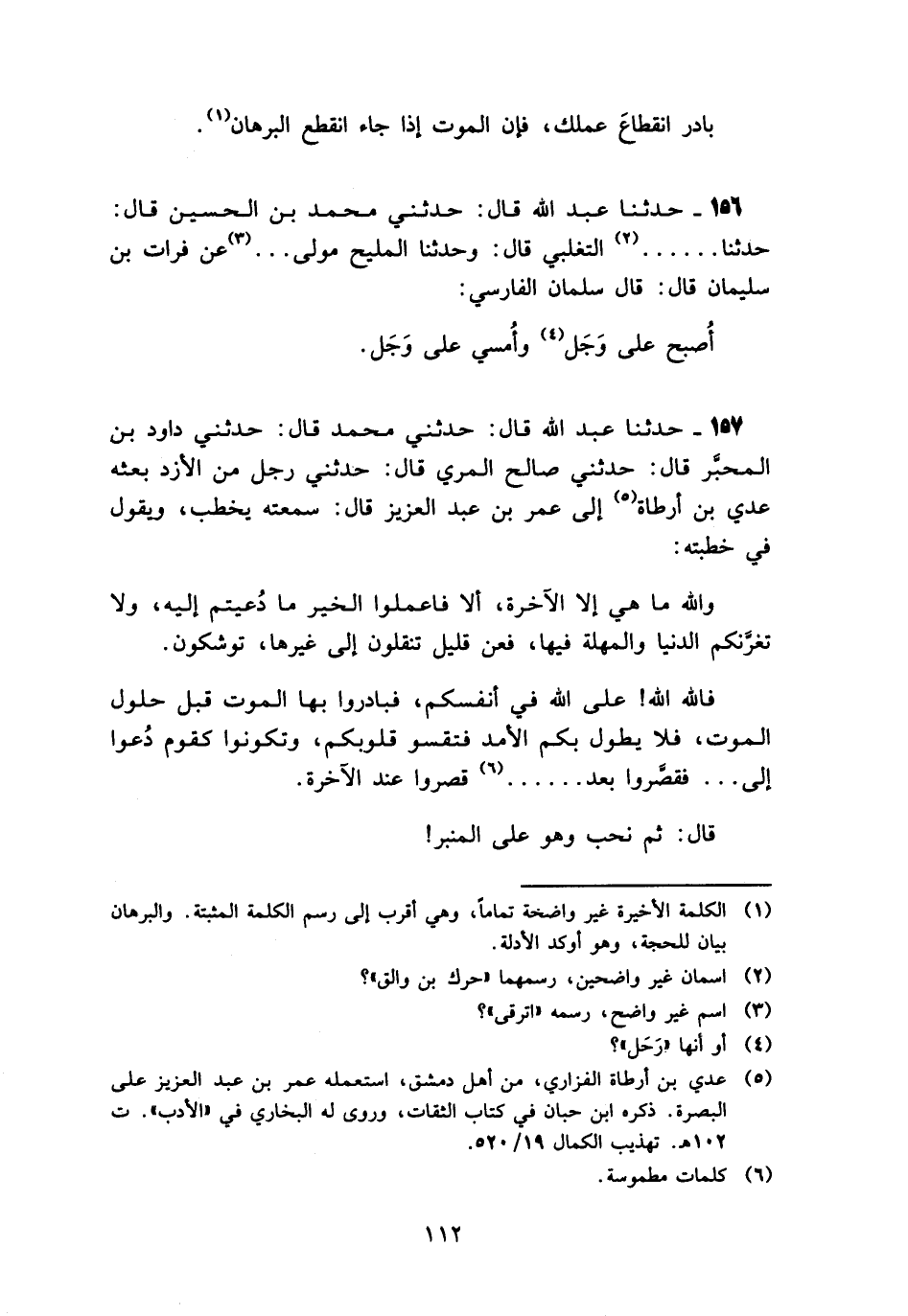 156 - حَدَّثَنَا عَبْدُ اللَّهِ قَالَ: حَدَّثَنِي مُحَمَّدُ بْنُ الْحُسَيْنِ، قَالَ: حَدَّثَنَا. . . التَّغْلِبِيُّ، قَالَ: وَحَدَّثَنَا الْمَلِيحُ مَوْلَى. . .، عَنْ فُرَاتِ بْنِ سُلَيْمَانَ، قَالَ: قَالَ سَلْمَانُ الْفَارِسِيُّ: «§أُصْبِحُ عَلَى وَجَلٍ وَأُمْسِي عَلَى وَجَلٍ»