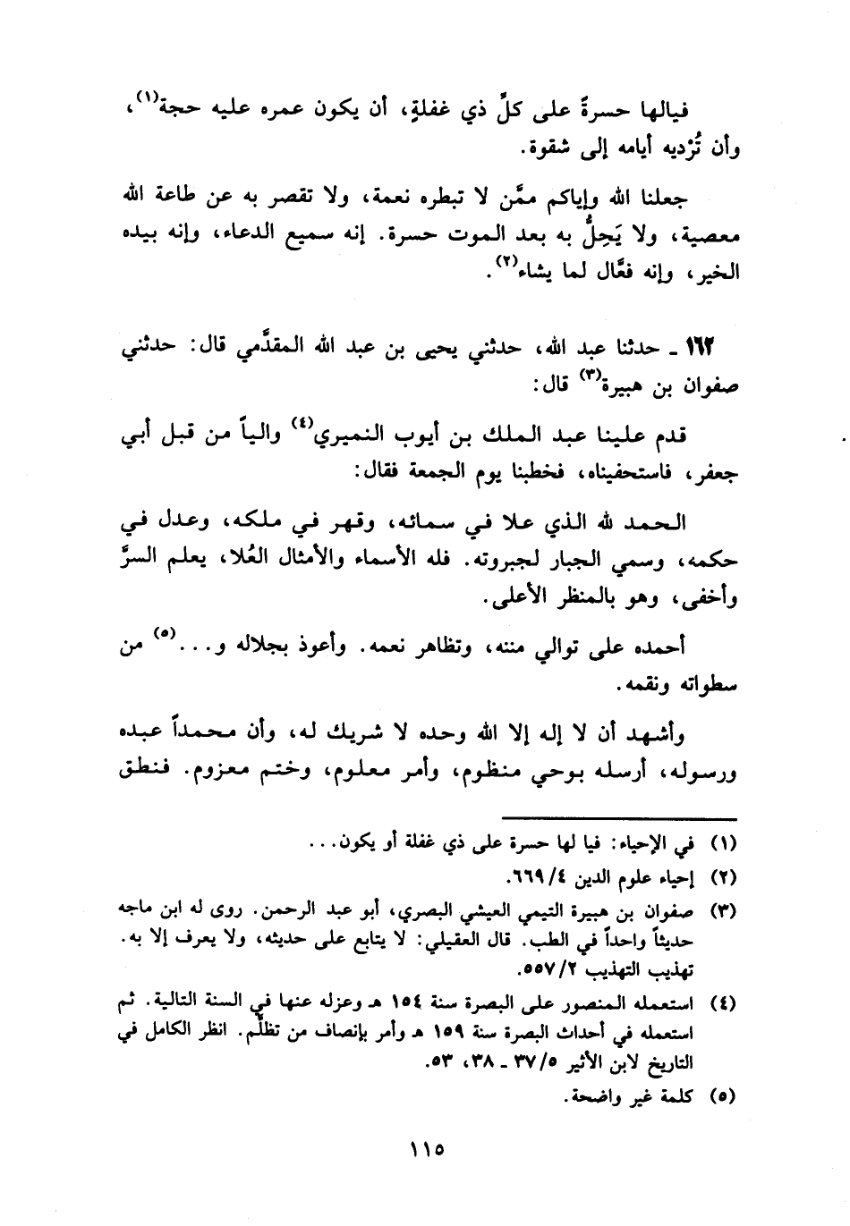 162 - حَدَّثَنَا عَبْدُ اللَّهِ، حَدَّثَنِي يَحْيَى بْنُ عَبْدِ اللَّهِ الْمُقَدَّمِيُّ، قَالَ: حَدَّثَنِي صَفْوَانُ بْنُ هُبَيْرَةَ، قَالَ: قَدِمَ عَلَيْنَا عَبْدُ الْمَلِكِ بْنُ أَيُّوبَ النُّمَيْرِيُّ وَالِيًا مِنْ قِبَلِ أَبِي جَعْفَرٍ، فَاسْتَحْفَيْنَاهُ، فَخَطَبَنَا يَوْمَ الْجُمُعَةِ فَقَالَ: «الْحَمْدُ لِلَّهِ الَّذِي عَلَا فِي سَمَائِهِ، وَقَهَرَ فِي مُلْكِهِ، وَعَدَلَ فِي حُكْمِهِ، وَسُمِّيَ الْجَبَّارَ، لِجَبَرُوتِهِ فَلَهُ الْأَسْمَاءُ وَالْأَمْثَالُ الْعُلَا، يَعْلَمُ السِّرَّ وَأَخْفَى، وَهُوَ بِالْمَنْظَرِ الْأَعْلَى أَحْمَدُهُ عَلَى تَوَالِي مِنَنِهِ، وَتَظَاهُرِ نِعَمِهِ، وَأَعُوذُ بِجَلَالِهِ وَ. . . مِنْ سَطَوَاتِهِ وَنِقَمِهِ وَأَشْهَدُ أَنَّ لَا إِلَهَ إِلَّا اللَّهُ وَحْدَهُ لَا شَرِيكَ لَهُ، وَأَنَّ مُحَمَّدًا عَبْدُهُ وَرَسُولُهُ، أَرْسَلَهُ بِوَحْيٍ مَنْظُومٍ، وَأَمْرٍ مَعْلُومٍ، وَخَتْمٍ مَعْزُومٍ، فَنَطَقَ -[116]- بِالصِّدْقِ، وَدَعَا إِلَى الْحَقِّ، وَكَانَ كَمَا قَالَ اللَّهُ عَزَّ وَجَلَّ رَءُوفًا رَحِيمًا، صَلَّى اللهُ عَلَيْهِ وَسَلَّمَ، أُوصِيكُمْ عِبَادَ اللَّهِ بِتَقْوَى اللَّهِ، وَأُحَذِّرُكُمُ الدُّنْيَا، فَلَقَدْ صَحَبَهَا أَقْوَامٌ، فَوَاللَّهِ مَا بَقِيَتْ لَهُمْ، وَلَا بَقُوا عَلَيْهَا بَلْ تَخَرَّمَتْهُمُ الْآجَالُ، وَأَفْنَتْهُمُ الْمَنَايَا فَصَارَتْ مَنَازِلُهُمْ حُفَرًا، وَصَارُوا لِلْقُبُورِ سُكَّانًا، وَلِلْأَمْوَاتِ جِيرَانًا، §فَبَادِرُوا الْمَوْتَ قَبْلَ أَنْ يَحِلَّ مِنْكُمْ بِحَوَالِئِهِ، وَيُمَكَّنُ مِنْكُمْ بِمَخَالِبِهِ فَيُطْفِئَ الْأَبْصَارَ نُورَهَا، وَيَحْمِلَ الْأَجْسَادَ إِلَى قُبُورِهَا. . . كَفَنَهُ، وَيُفَرَّقُ بَيْنَهُ وَبَيْنَ سَكَنِهِ، وَيُلْحَقُ بِسَيِّئِهِ وَحَسَنِهِ، وَيَقِلُّ الرَّدَّ عَنْهُ الْبَوَاكِي، وَتُوُلَّى عَنْهُ الْأَكُفُّ الْحَوَانِي، وَيَصِيرُ بِمَنْزِلَةِ الْغَرِيبِ الثَّاوِي وَلَا يُمَدُّ لَهُ فِي الْأَجَلِ، وَلَا يُعَدَّدُ بِالْعِلَلِ، وَلَا يُؤَخَّرُ لِلْعَمَلِ، وَقَبْلَ الْيَوْمِ الْعَسِيرِ، وَالشَّرِّ الْمُسْتَطِيرِ»