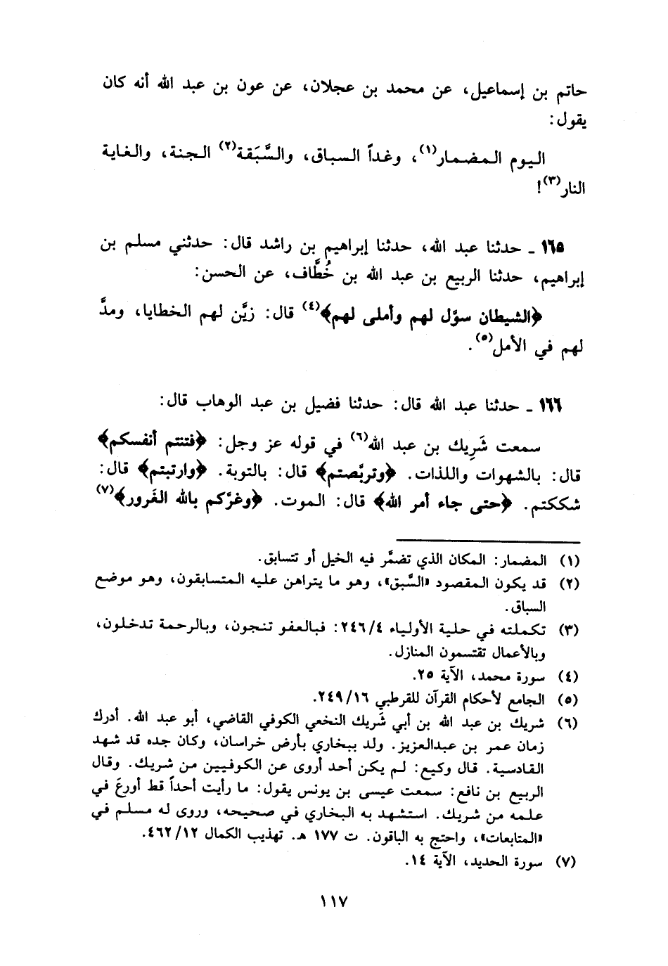 166 - حَدَّثَنَا عَبْدُ اللَّهِ قَالَ: حَدَّثَنَا فُضَيْلُ بْنُ عَبْدِ الْوَهَّابِ، قَالَ: سَمِعْتُ شَرِيكَ بْنَ عَبْدِ اللَّهِ فِي قَوْلِهِ عَزَّ وَجَلَّ: {§فَتَنْتُمْ أَنْفُسَكُمْ} [الحديد: 14] , قَالَ: «بِالشَّهَوَاتِ وَاللَّذَّاتِ» ، {وَتَرَبَّصْتُمْ} [الحديد: 14] , قَالَ: «بِالتَّوْبَةِ» ، {وَارْتَبْتُمْ} [الحديد: 14] قَالَ: «شَكَكْتُمْ» {حَتَّى جَاءَ أَمْرُ اللَّهِ} [الحديد: 14] , قَالَ: «الْمَوْتُ» ، {وَغَرَّكُمْ بِاللَّهِ الْغُرُورُ} [الحديد: 14]