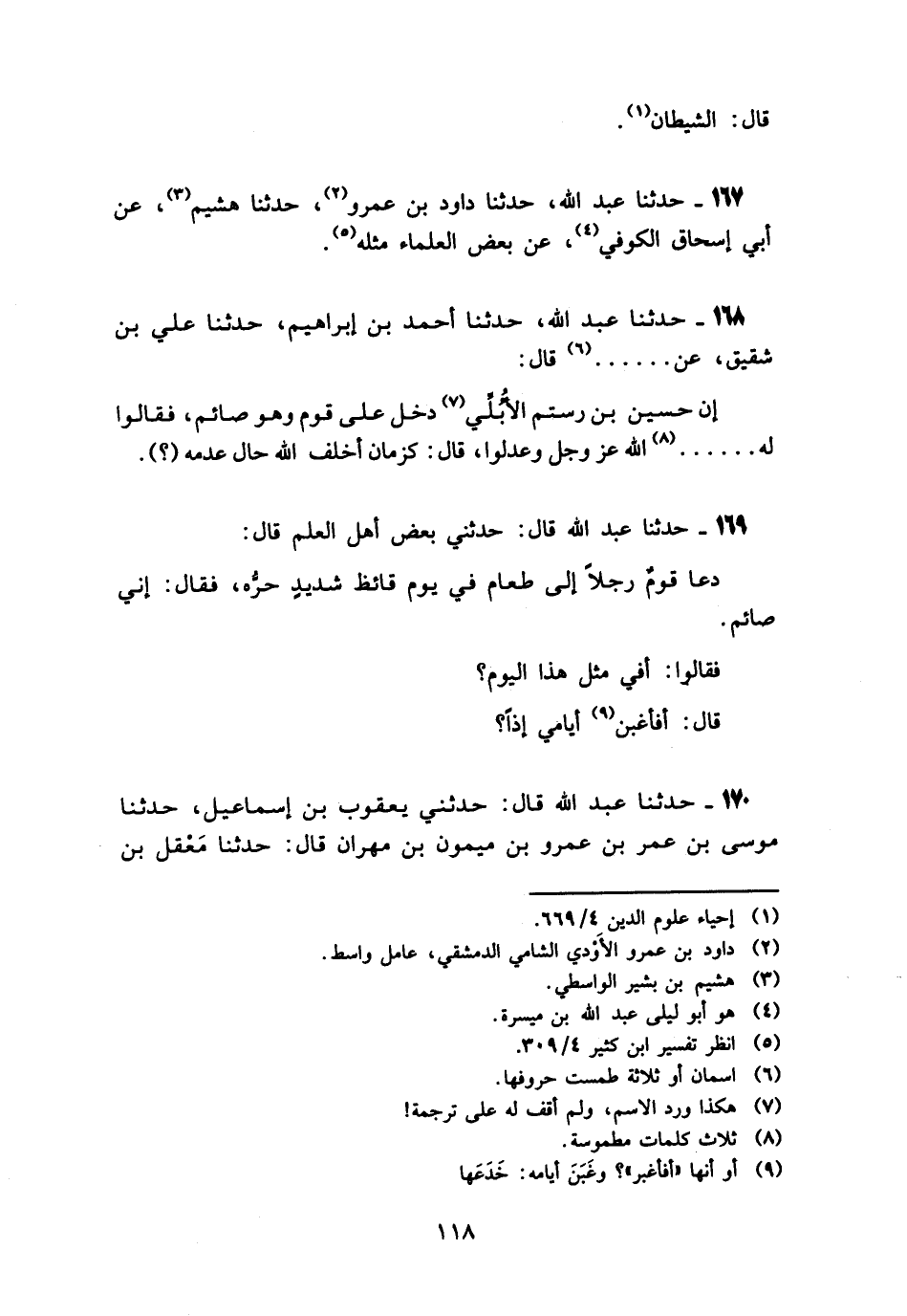 168 - حَدَّثَنَا عَبْدُ اللَّهِ، حَدَّثَنَا أَحْمَدُ بْنُ إِبْرَاهِيمَ، حَدَّثَنَا عَلِيُّ بْنُ شَقِيقٍ، عَنْ. . . قَالَ: إِنَّ حُسَيْنَ بْنَ رُسْتُمَ الْأُبُلِّيَّ دَخَلَ عَلَى قَوْمٍ وَهُوَ صَائِمٌ، فَقَالُوا لَهُ. . . اللَّهُ عَزَّ وَجَلَّ وَعَدَلُوا قَالَ: «§كَزَمَانٍ أَخْلَفَ اللَّهُ حَالَ عَدَمِهِ؟»