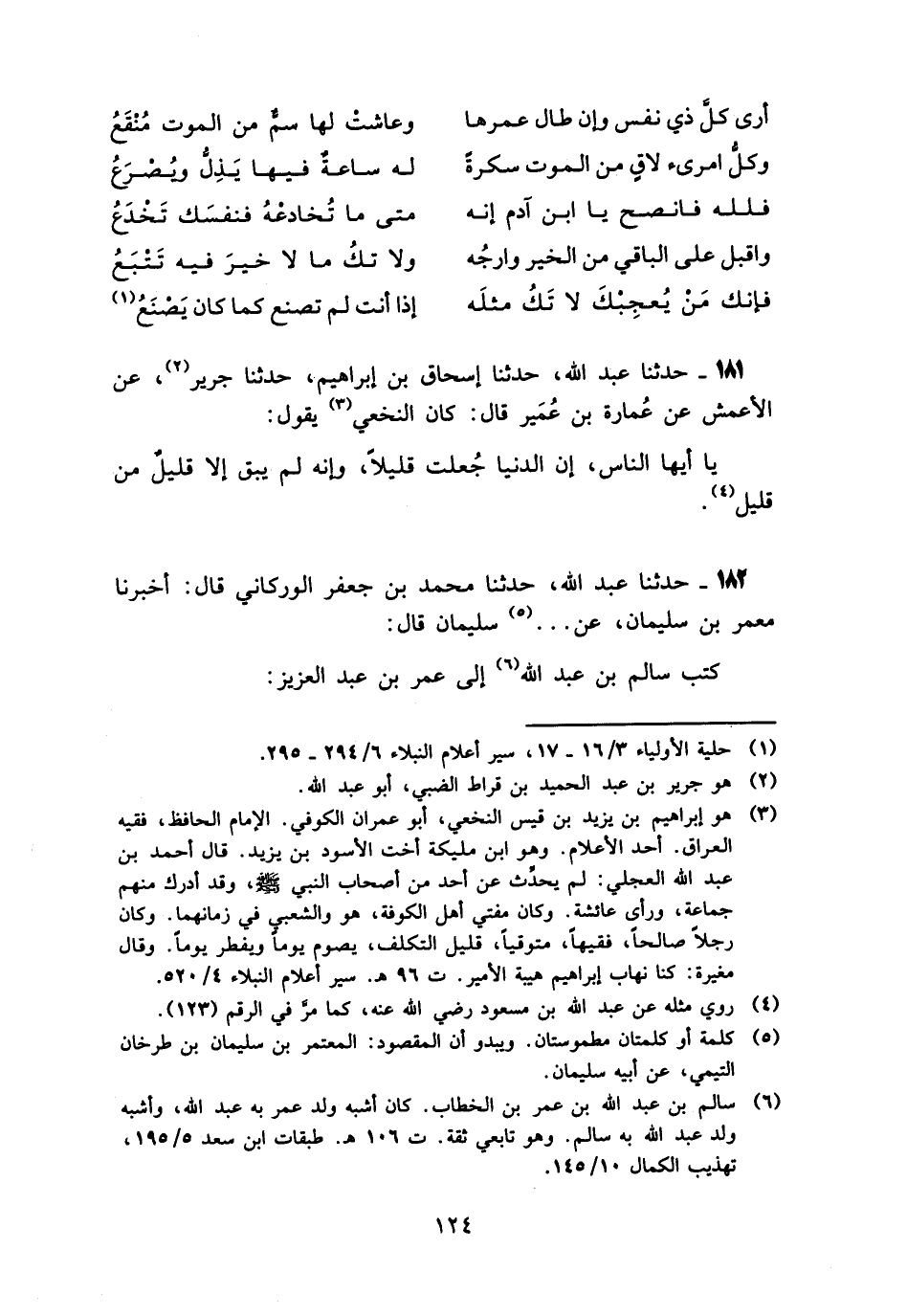 181 - حَدَّثَنَا عَبْدُ اللَّهِ، حَدَّثَنَا إِسْحَاقُ بْنُ إِبْرَاهِيمَ، حَدَّثَنَا جَرِيرٌ، عَنِ الْأَعْمَشِ، عَنْ عُمَارَةَ بْنِ عُمَيْرٍ، قَالَ: كَانَ النَّخَعِيُّ يَقُولُ: «يَا أَيُّهَا النَّاسُ، إِنَّ §الدُّنْيَا جُعِلَتْ قَلِيلًا، وَإِنَّهُ لَمْ يَبْقَ إِلَّا قَلِيلٌ مِنْ قَلِيلٍ»