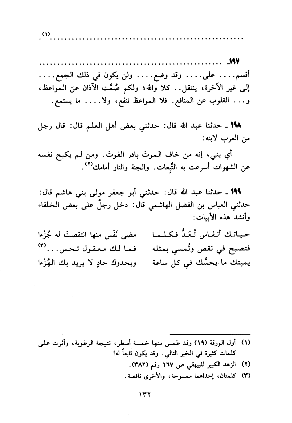 198 - حَدَّثَنَا عَبْدُ اللَّهِ قَالَ: حَدَّثَنِي بَعْضُ أَهْلِ الْعِلْمِ، قَالَ: قَالَ رَجُلٌ مِنَ الْعَرَبِ لِابْنِهِ: «أَيْ بُنَيَّ إِنَّهُ §مَنْ خَافَ الْمَوْتَ بَادَرَ الْفَوْتَ، وَمَنْ لَمْ يَكْبَحْ نَفْسَهُ عَنِ الشَّهَوَاتِ أَسْرَعَتْ بِهِ التَّبِعَاتُ، وَالْجَنَّةُ وَالنَّارُ أَمَامَكَ»