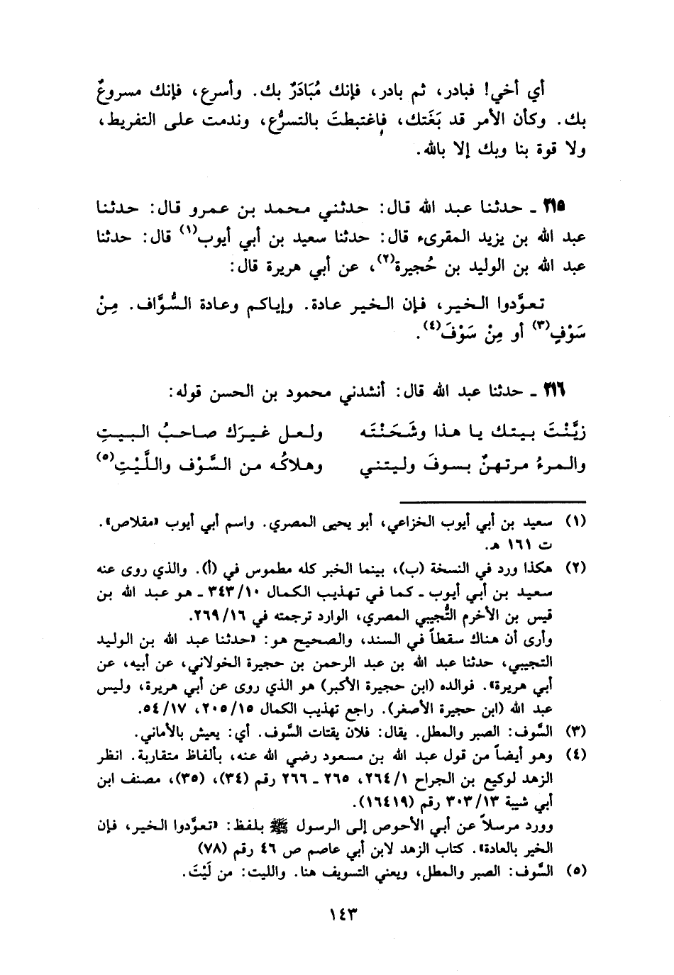 215 - حَدَّثَنَا عَبْدُ اللَّهِ قَالَ: حَدَّثَنِي مُحَمَّدُ بْنُ عَمْرٍو، قَالَ: حَدَّثَنَا عَبْدُ اللَّهِ بْنُ يَزِيدَ الْمُقْرِئُ، قَالَ: حَدَّثَنَا سَعِيدُ بْنُ أَبِي أَيُّوبَ، قَالَ: حَدَّثَنَا عَبْدُ اللَّهِ بْنُ الْوَلِيدِ عَنْ عَبْدِ الْرَحْمَنِ بْنِ حُجَيْرَةَ، عَنْ أَبِي هُرَيْرَةَ، قَالَ: «§تَعَوَّدُوا الْخَيْرَ، فَإِنَّ الْخَيْرَ عَادَةٌ، وَإِيَّاكُمْ وَعَادَةَ السُّوَّافِ مِنْ سَوْفٍ، أَوْ مِنْ سَوْفَ»