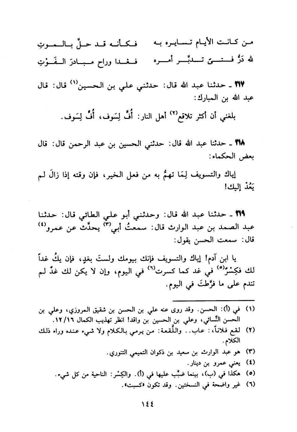 219 - حَدَّثَنَا عَبْدُ اللَّهِ قَالَ: وَحَدَّثَنِي أَبُو عَلِيٍّ الطَّائِيُّ، قَالَ: حَدَّثَنَا عَبْدُ الصَّمَدِ بْنُ عَبْدِ الْوَارِثِ، قَالَ: سَمِعْتُ أَبِي، يُحَدِّثُ عَنْ عَمْرٍو، قَالَ: سَمِعْتُ الْحَسَنَ، يَقُولُ: «يَا ابْنَ آدَمَ §إِيَّاكَ وَالتَّسْوِيفَ فَإِنَّكَ بِيَوْمِكِ وَلَسْتَ بِغَدٍ، فَإِنْ يَكُ غَدًا لَكَ فَكِسْرٌ فِي غَدٍ كَمَا كَسَبْتَ فِي الْيَوْمِ، وَإِنْ لَا يَكُنْ لَكَ غَدٌ لَمْ تَنْدَمْ عَلَى مَا فَرَّطْتَ فِي الْيَوْمِ»