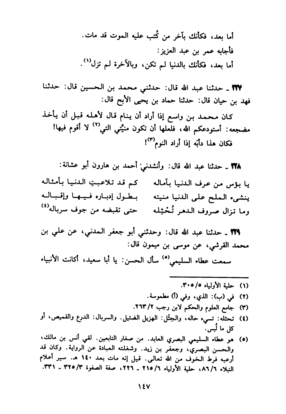229 - حَدَّثَنَا عَبْدُ اللَّهِ قَالَ: وَحَدَّثَنِي أَبُو جَعْفَرٍ الْمَدَنِيُّ، عَنْ عَلِيِّ بْنِ مُحَمَّدٍ الْقُرَشِيِّ، عَنْ مُوسَى بْنِ مَيْمُونٍ، قَالَ: سَمِعْتُ عَطَاءً السَّلِيمِيَّ، سَأَلَ الْحَسَنَ: يَا أَبَا سَعِيدٍ، أَكَانَتِ الْأَنْبِيَاءُ -[148]- يَنْشَرِحُونَ إِلَى الدُّنْيَا وَالنِّسَاءِ مَعَ عِلْمِهِمْ بِاللَّهِ؟، قَالَ: «نَعَمْ، إِنَّ لِلَّهِ تَرَائِكَ فِي عِبَادِهِ» ، فَقُلْتُ لِعَطَاءٍ: أَلَا سَأَلْتُهُ مَا التَّرَائِكُ؟ قَالَ: هِبْتُهُ , فَلَقِيتُ مَالِكَ بْنَ دِينَارٍ، فَأَخْبَرْتُهُ، وَقُلْتُ لَهُ: سَلْهُ، فَلَقِيَهُ، فَسَأَلَهُ كَمَا سَأَلَهُ عَطَاءٌ، فَأَخْبَرَهُ، وَسَكَتَ، فَقُلْتُ: سَلْهُ مَا التَّرَائِكُ؟ قَالَ: أَهَابُهُ , فَلَقِيتُ أَبَا عُبَيْدَةَ النَّاجِيَّ، فَقُلْتُ لَهُ، فَقَالَ: أَكْفِيكَ، وَأَقْبَلَ مَعِي، فَلَمَّا صِرْنَا عِنْدَ الْحَسَنِ، قَالَ: اعْفُنِي، فَذَكَرَ الْحَسَنُ يَوْمًا حَدِيثًا، " أَنَّ §لِلَّهِ تَرَائِكَ فِي خَلْقِهِ: الْأَجَلُ، وَالْأَمَلُ، وَالنِّسْيَانُ، وَلَوْلَا ذَلِكَ لَمْ يَنْشَرِحِ النَّبِيُّونَ وَأَهْلُ الْعِلْمِ بِاللَّهِ إِلَى الدُّنْيَا وَالنِّسَاءِ "