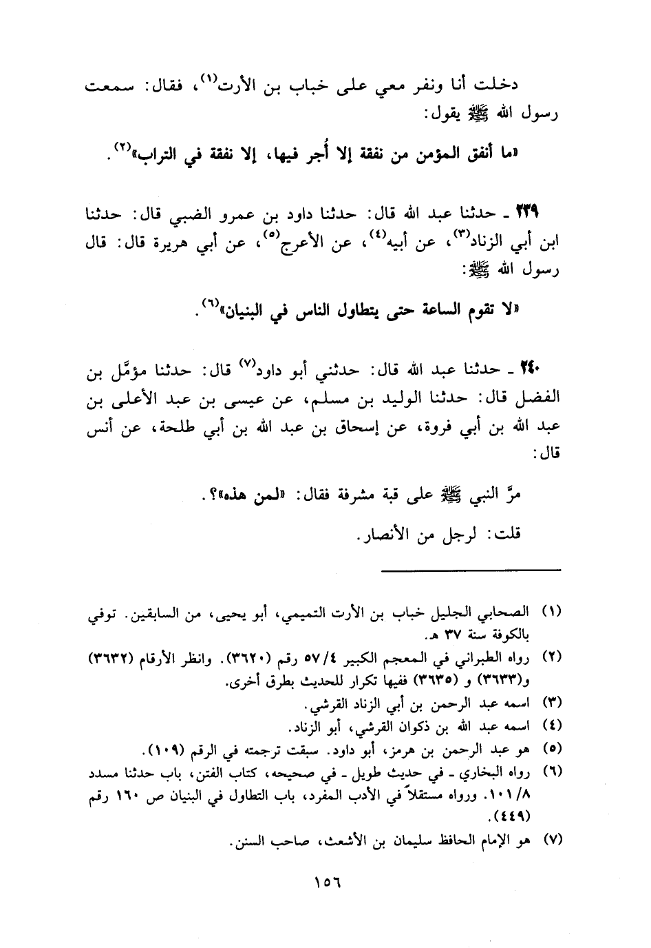 240 - حَدَّثَنَا عَبْدُ اللَّهِ قَالَ: حَدَّثَنِي أَبُو دَاوُدَ، قَالَ: حَدَّثَنَا مُؤَمَّلُ بْنُ الْفَضْلِ، قَالَ: حَدَّثَنَا الْوَلِيدُ بْنُ مُسْلِمٍ، عَنْ عِيسَى بْنِ عَبْدِ الْأَعْلَى بْنِ عَبْدِ اللَّهِ بْنِ أَبِي فَرْوَةَ، عَنْ إِسْحَاقَ بْنِ عَبْدِ اللَّهِ بْنِ أَبِي طَلْحَةَ، عَنْ أَنَسٍ، قَالَ: مَرَّ النَّبِيُّ صَلَّى اللهُ عَلَيْهِ وَسَلَّمَ عَلَى قُبَّةٍ مُشْرِفَةٍ فَقَالَ «لِمَنْ هَذِهِ؟» قُلْتُ: لِرَجُلٍ مِنَ الْأَنْصَارِ -[157]-، فَقَالَ: «§إِنَّ كُلَّ بِنَاءٍ وَبَالٌ عَلَى صَاحِبِهِ يَوْمَ الْقِيَامَةِ إِلَّا مَا» ، فَبَلَغَ الرَّجُلُ فَهَدَمَهَا، فَقَالَ النَّبِيُّ صَلَّى اللهُ عَلَيْهِ وَسَلَّمَ: «رَحِمَهُ اللَّهُ»