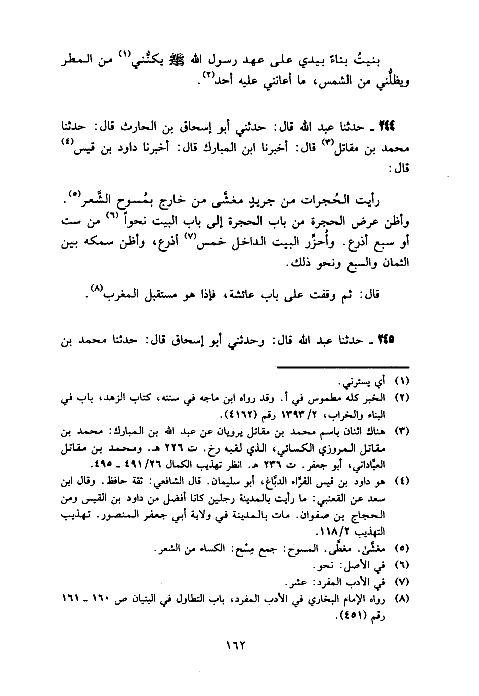 244 - حَدَّثَنَا عَبْدُ اللَّهِ قَالَ: حَدَّثَنِي أَبُو إِسْحَاقَ بْنُ الْحَارِثِ، قَالَ: حَدَّثَنَا مُحَمَّدُ بْنُ مُقَاتِلٍ، قَالَ: أَخْبَرَنَا ابْنُ الْمُبَارَكِ، قَالَ: أَخْبَرَنَا دَاوُدُ بْنُ قَيْسٍ، قَالَ: «رَأَيْتُ §الْحُجُرَاتِ مِنْ جَرِيدٍ مُغَشًّى مِنْ خَارِجٍ بِمُسُوحِ الشَّعْرِ، وَأَظُنُّ عَرْضَ الْحُجْرَةِ مِنْ بَابِ الْحُجْرَةِ إِلَى بَابِ الْبَيْتِ نَحْوًا مِنْ سِتِّ أَوْ سَبْعِ أَذْرُعٍ، وَأَحْزُرُ الْبَيْتِ الدَّاخِلِ خَمْسُ أَذْرُعٍ، وَأَظُنُّ سُمْكَهُ بَيْنَ الثَّمَانِ وَالسَّبْعِ وَنَحْوَ ذَلِكَ» ، قَالَ: «ثُمَّ وَقَفْتُ عَلَى بَابِ عَائِشَةَ، فَإِذَا هُوَ مُسْتَقْبِلٌ الْمَغْرِبَ»