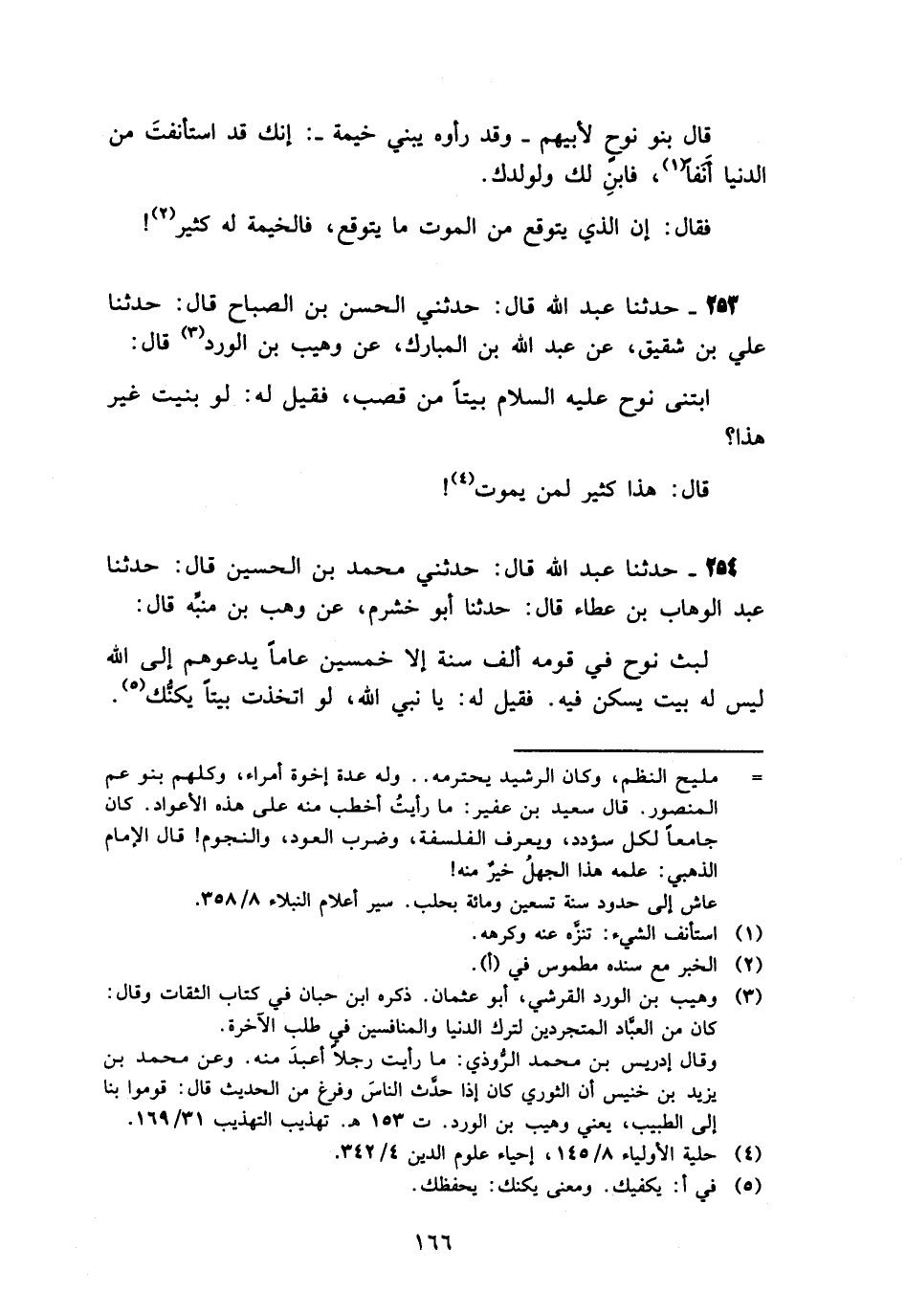 253 - حَدَّثَنَا عَبْدُ اللَّهِ قَالَ: حَدَّثَنِي الْحَسَنُ بْنُ الصَّبَّاحِ، قَالَ: حَدَّثَنَا عَلِيُّ بْنُ شَقِيقٍ، عَنْ عَبْدِ اللَّهِ بْنِ الْمُبَارَكِ، عَنْ وُهَيْبِ بْنِ الْوَرْدِ، قَالَ: ابْتَنَى نُوحٌ عَلَيْهِ السَّلَامُ بَيْتًا مِنْ قَصَبٍ، فَقِيلَ لَهُ: لَوْ بَنَيْتَ غَيْرَ هَذَا؟ قَالَ: «§هَذَا كَثِيرٌ لِمَنْ يَمُوتُ»