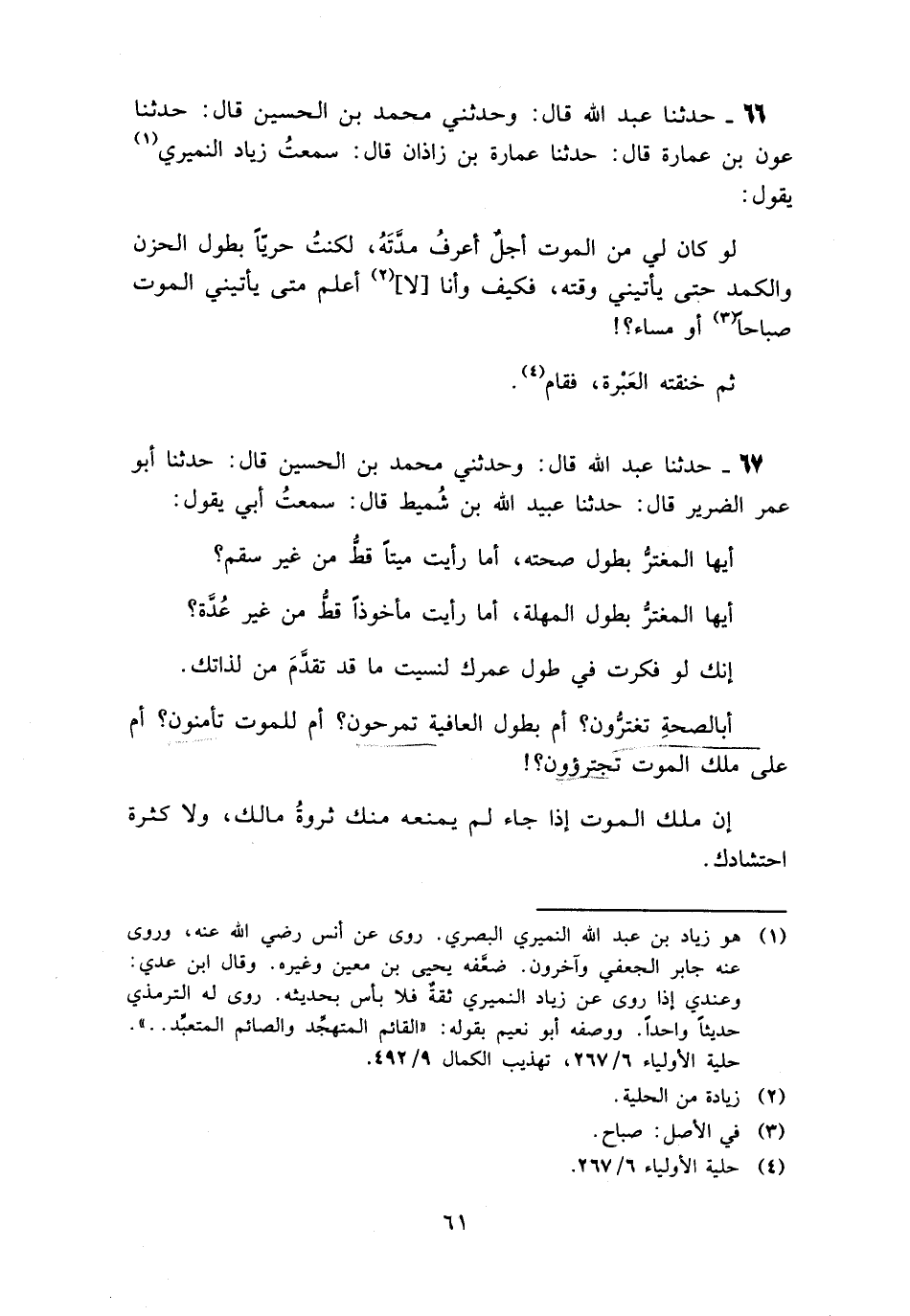 66 - حَدَّثَنَا عَبْدُ اللَّهِ قَالَ: وَحَدَّثَنِي مُحَمَّدُ بْنُ الْحُسَيْنِ، قَالَ: حَدَّثَنَا عَوْنُ بْنُ عُمَارَةَ، قَالَ: حَدَّثَنَا عُمَارَةُ بْنُ زَاذَانَ، قَالَ: سَمِعْتُ زِيَادًا النُّمَيْرِيَّ، يَقُولُ: «§لَوْ كَانَ لِي مِنَ الْمَوْتِ أَجَلٌ أَعْرِفُ مُدَّتَهَ، لَكُنْتُ حَرِيًّا بِطُولِ الْحُزْنِ وَالْكَمَدِ حَتَّى يَأْتِيَنِي وَقْتُهُ، فَكَيْفَ وَأَنَا لَا أَعْلَمُ مَتَى يَأْتِينِي الْمَوْتُ صَبَاحًا أَوْ مَسَاءً؟» ثُمَّ خَنَقَتْهُ الْعَبْرَةُ، فَقَامَ