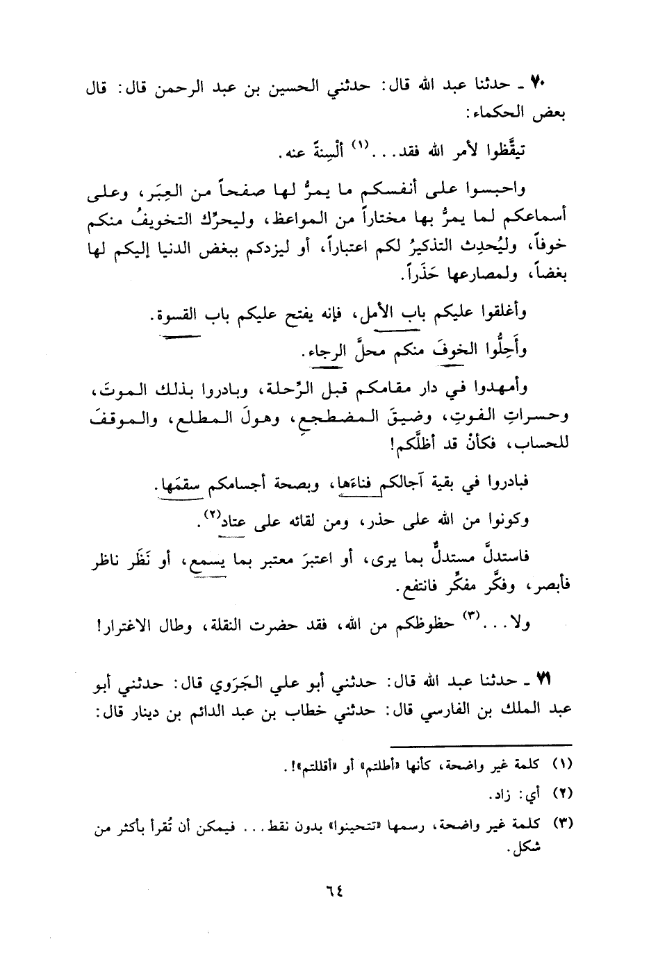 71 - حَدَّثَنَا عَبْدُ اللَّهِ قَالَ: حَدَّثَنِي أَبُو عَلِيٍّ الْجَرَوِيُّ، قَالَ: حَدَّثَنِي أَبُو عَبْدِ الْمَلِكِ بْنُ الْفَارِسِيِّ قَالَ: حَدَّثَنِي خَطَّابُ بْنُ عَبْدِ الدَّائِمِ بْنِ دِينَارٍ، قَالَ -[65]-: كَتَبَ أَبُو عُتْبَةَ عَبَّادٌ الْخَوَّاصُ إِلَى سُلَيْمَانَ بْنِ حَيَّانَ أَبِي خَالِدٍ الْأَحْمَرِ: «أَمَّا بَعْدُ، فَإِنِّي §أُوصِيكَ بِتَقْوَى اللَّهِ، وَحُسْنِ النَّظَرِ مِمَّا هُوَ مَنْظُورٌ فِيهِ مِنْ أَمْرِكَ، وَأَعْرِضْ نَفْسَكَ قَبْلَ عَرْضِ اللَّهِ إِيَّاكَ، وَبَادِرِ الْأَجَلَ بِصَالِحِ الْعَمَلِ قَبْلَ فَوْتِ ذَلِكَ وَالْأَسَفِ عَلَيْهِ، فَالْعَجَبُ لِمَوْقِعِ هَذَا الْخَطَرِ مِنَ الْقُلُوبِ مَعَ الْمَعْرِفَةِ بِفَنَائِهِ وَالْعِلْمِ بِمَا مَضَى مِنْهُ وَمَنْ أَهْلِهِ، هَلْ فِيهِمْ مَغْبُوطٌ بِشَيْءٍ كَانَ فِيهِ؟، أَمْ هَلْ مِنْهُمْ ظَاعِنٌ بِشَيْءٍ مَعَهُ؟، أَمْ هَلْ مِنْهُمْ مَرْدُودٌ إِلَى مُعْتَمِدٍ، فَأَتَى كِتَابُكَ فَسُرِرْتُ بِعَافِيَةِ اللَّهِ؟ إِيَّاكُمْ. . غَلَبَةَ الْهَوَى عَلَى الْمَعْرِفَةِ، قَدْ كَانَ السُّرُورُ بِالْمَوْتِ أَحَقَّ، وَلَكِنَّا نَسْأَلُ اللَّهَ لَنَا وَلَكَ بَرَكَةَ عَطَائِهِ، وَاللُّطْفَ بِالسَّلَامَةِ فِيمَا أَخَّرَنَا لَهُ، فَقَدْ. . . الْمَوْتَ الصَّالِحُونَ قَبْلَنَا عِنْدَ وُقُوعِ أَوَائِلِ. . . فِي جُمْهُورِهَا. إِنَّمَا وَصَفَ. . . مِنْهَا. . . لَا نَعْرِفُهُ مِنْ أَنْفُسِنَا، وَلَا نَنَالُهُ إِلَّا بِاللَّهِ تَعَالَى. نَحْنُ مُعَافُونَ، وَمَا يَأْتِينَا مِنْ نِعَمِ اللَّهِ عَظِيمٌ»