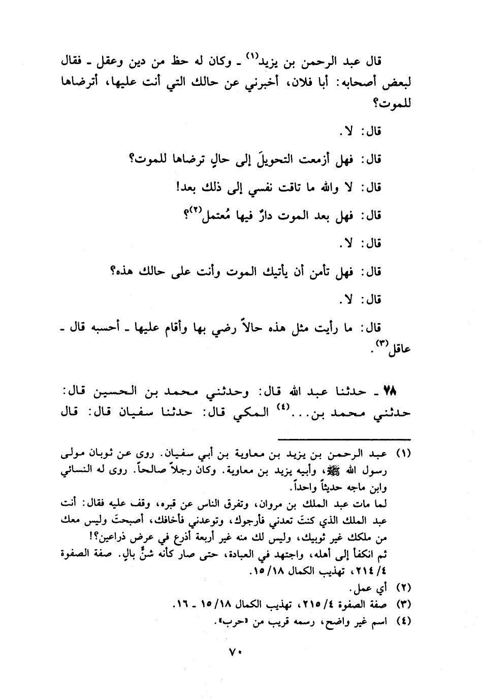 78 - حَدَّثَنَا عَبْدُ اللَّهِ قَالَ: وَحَدَّثَنِي مُحَمَّدُ بْنُ الْحُسَيْنِ، قَالَ: حَدَّثَنِي مُحَمَّدُ بْنُ. . . الْمَكِّيُّ، قَالَ: حَدَّثَنَا سُفْيَانُ، قَالَ: قَالَ -[71]- الْقَعْقَاعُ بْنُ حَكِيمٍ: «قَدِ §اسْتَعْدَدْتُ لِلْمَوْتِ مُنْذُ ثَلَاثِينَ سَنَةً، فَلَوْ أَتَانِي مَا أَحْبَبْتُ تَأْخِيرَ شَيْءٍ عَنْ شَيْءٍ»