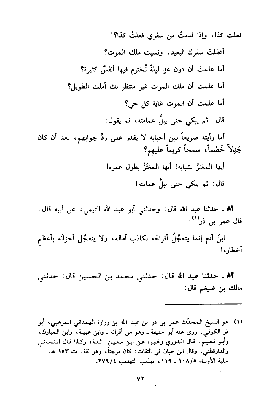 81 - حَدَّثَنَا عَبْدُ اللَّهِ قَالَ: وَحَدَّثَنِي أَبُو عَبْدِ اللَّهِ التَّيْمِيُّ، عَنْ أَبِيهِ، قَالَ: قَالَ عُمَرُ بْنُ ذَرٍّ، «ابْنُ آدَمَ إِنَّمَا §يَتَعَجَّلُ أَفْرَاحَهُ بِكَاذِبِ آمَالِهِ، وَلَا يَتَعَجَّلُ أَحْزَانَهُ بِأَعْظَمِ أَخْطَارِهِ»
