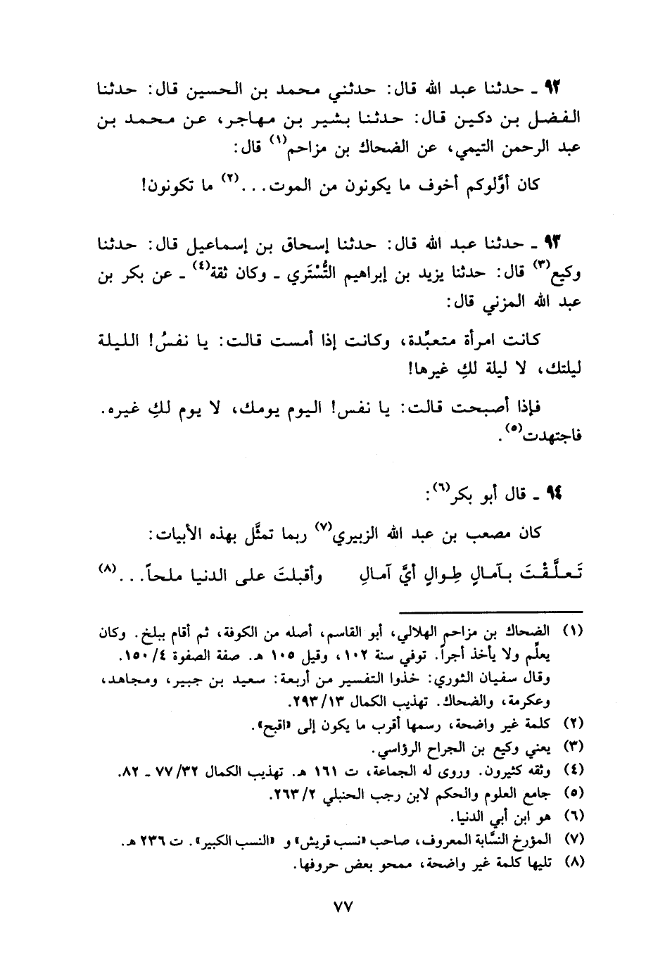92 - حَدَّثَنَا عَبْدُ اللَّهِ قَالَ: حَدَّثَنِي مُحَمَّدُ بْنُ الْحُسَيْنِ، قَالَ: حَدَّثَنَا الْفَضْلُ بْنُ دُكَيْنٍ، قَالَ: حَدَّثَنَا بَشِيرُ بْنُ مُهَاجِرٍ، عَنْ مُحَمَّدِ بْنِ عَبْدِ الرَّحْمَنِ التَّيْمِيِّ، عَنِ الضَّحَّاكِ بْنِ مُزَاحِمٍ، قَالَ: «§كَانَ أَوَّلُوكُمْ أَخْوَفَ مَا يَكُونُونَ مِنَ الْمَوْتِ. . مَا تَكُونُونَ»