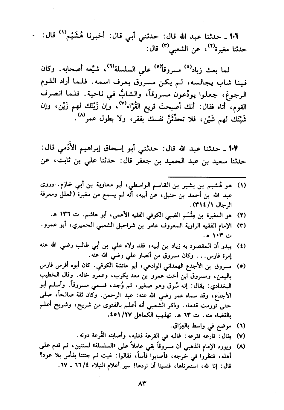 106 - حَدَّثَنَا عَبْدُ اللَّهِ قَالَ: حَدَّثَنِي أَبِي، قَالَ: أَخْبَرَنَا هُشَيْمٌ، قَالَ: حَدَّثَنَا مُغِيرَةُ، عَنِ الشَّعْبِيِّ، قَالَ: لَمَّا بَعَثَ زِيَادٌ مَسْرُوقًا عَلَى السِّلْسِلَةِ، شَيَّعَهُ أَصْحَابُهُ، وَكَانَ فِينَا شَابٌّ يُجَالِسُهُ، لَمْ يَكُنْ مَسْرُوقٌ يَعْرِفُ اسْمَهُ، فَلَمَّا أَرَادَ الْقَوْمُ الرُّجُوعَ، جَعَلُوا يُوَدِّعُونَ مَسْرُوقًا، وَالشَّابُّ فِي نَاحِيَةٍ، فَلَمَّا انْصَرَفَ الْقَوْمُ، أَتَاهُ فَقَالَ: «إِنَّكَ أَصْبَحْتَ قَرِيعَ الْقُرَّاءِ، وَإِنَّ زَيْنَكَ لَهُمْ زَيْنٌ، وَإِنَّ شَيْنَكَ لَهُمْ شَيْنٌ، §فَلَا تُحَدِّثَنَّ نَفْسَكَ بِفَقْرٍ، وَلَا بِطُولِ عُمْرٍ»
