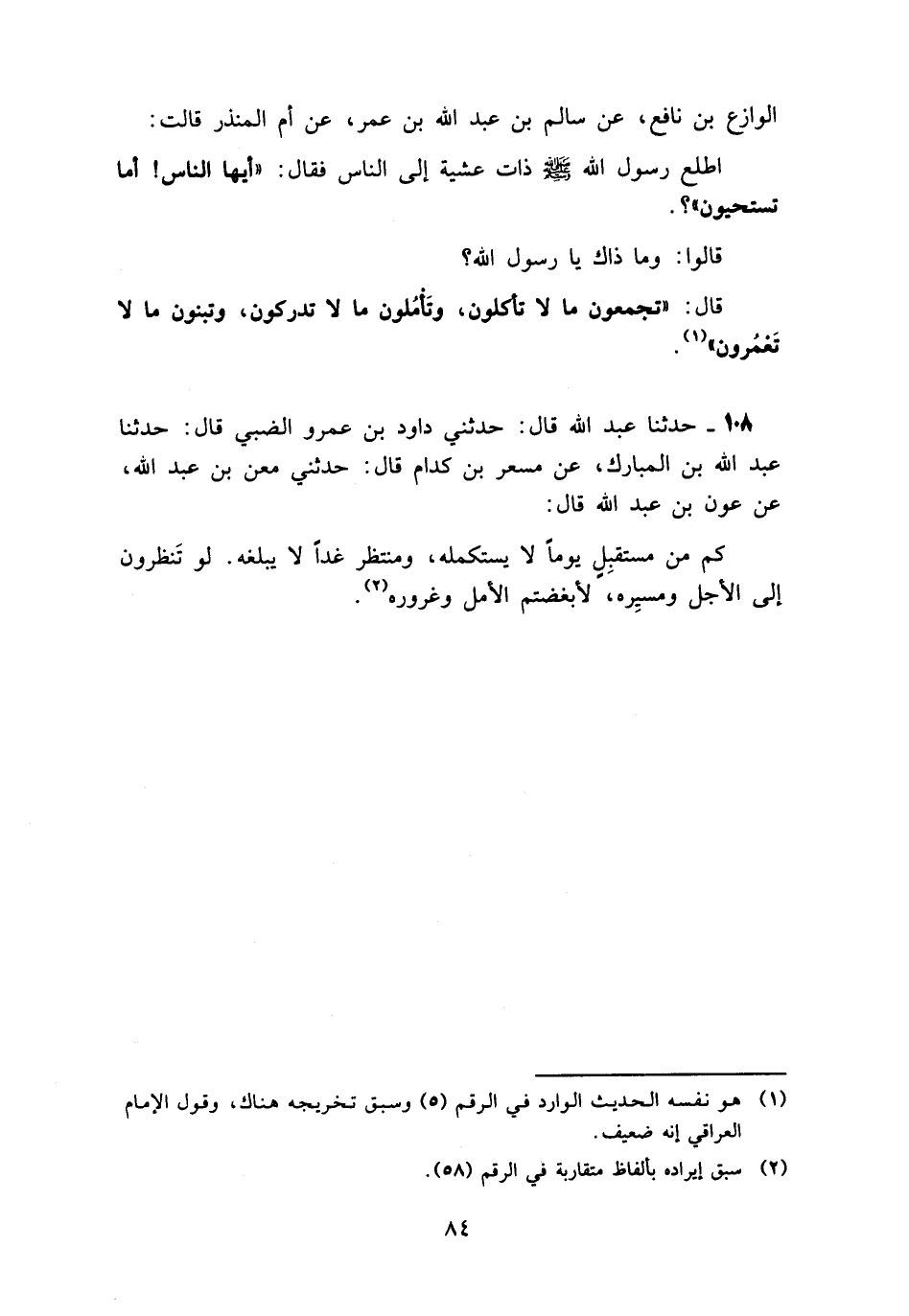108 - حَدَّثَنَا عَبْدُ اللَّهِ قَالَ: حَدَّثَنِي دَاوُدُ بْنُ عَمْرٍو الضَّبِّيُّ، قَالَ: حَدَّثَنَا عَبْدُ اللَّهِ بْنُ الْمُبَارَكِ، عَنْ مِسْعَرِ بْنِ كِدَامٍ، قَالَ: حَدَّثَنِي مَعْنُ بْنُ عَبْدِ اللَّهِ، عَنْ عَوْنِ بْنِ عَبْدِ اللَّهِ، قَالَ: «§كَمْ مِنْ مُسْتَقْبِلٍ يَوْمًا لَا يَسْتَكْمِلُهُ، وَمُنْتَظِرٍ غَدًا لَا يَبْلُغُهُ، لَوْ تَنْظُرُونَ إِلَى الْأَجَلِ وَمَسِيرِهِ، لَأَبْغَضْتُمُ الْأَمَلَ وَغُرُورَهُ»