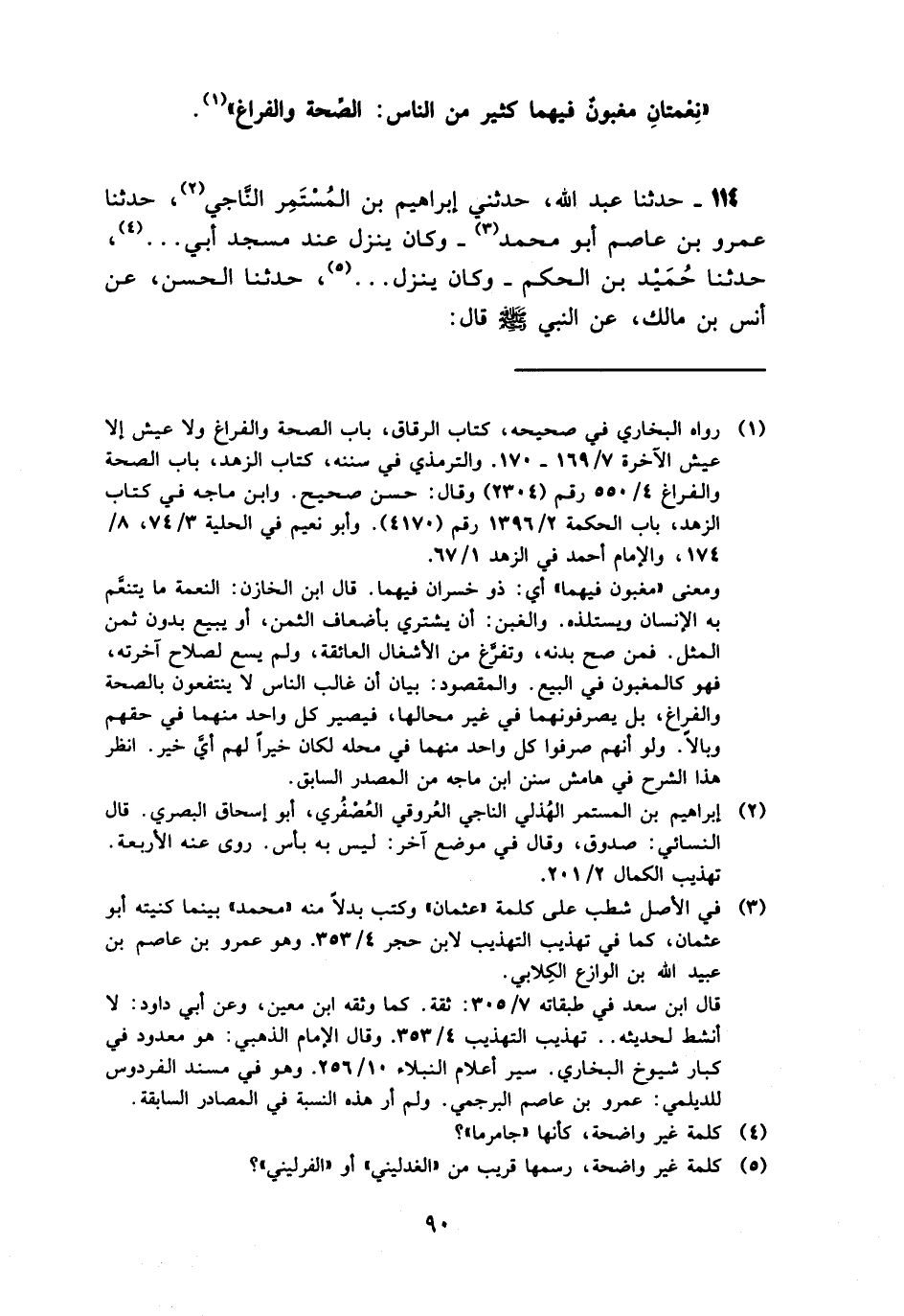 114 - حَدَّثَنَا عَبْدُ اللَّهِ، حَدَّثَنِي إِبْرَاهِيمُ بْنُ الْمُسْتَمِرِّ النَّاجِيُّ، حَدَّثَنَا عَمْرُو بْنُ عَاصِمٍ أَبُو مُحَمَّدٍ، وَكَانَ يَنْزِلُ عِنْدَ مَسْجِدِ أَبِي. .، حَدَّثَنَا حُمَيْدُ بْنُ الْحَكَمِ، وَكَانَ يَنْزِلُ. .، حَدَّثَنَا الْحَسَنُ، عَنْ أَنَسِ بْنِ مَالِكٍ، عَنِ النَّبِيِّ صَلَّى اللهُ عَلَيْهِ وَسَلَّمَ قَالَ -[91]-: " §غَنِيمَتَانِ غَنِمَهُمَا كَثِيرٌ مِنَ النَّاسِ: الصِّحَّةُ وَالْفَرَاغُ "
