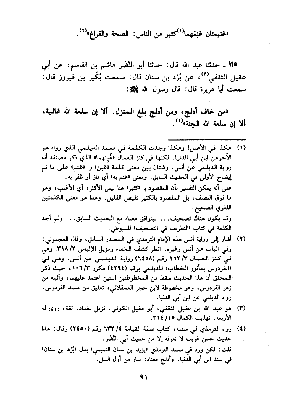 115 - حَدَّثَنَا عَبْدُ اللَّهِ قَالَ: حَدَّثَنَا أَبُو النَّضْرِ هَاشِمُ بْنُ الْقَاسِمِ، عَنْ أَبِي عَقِيلٍ الثَّقَفِيِّ، عَنْ بُرْدِ بْنِ سِنَانٍ، قَالَ: سَمِعْتُ بُكَيْرَ بْنَ فَيْرُوزَ، قَالَ: سَمِعْتُ أَبَا هُرَيْرَةَ، قَالَ: قَالَ رَسُولُ اللَّهِ صَلَّى اللهُ عَلَيْهِ وَسَلَّمَ: «§مَنْ خَافَ أَدْلَجَ، وَمَنْ أَدْلَجَ بَلَغَ الْمَنْزِلَ، أَلَا إِنَّ سِلْعَةَ اللَّهِ غَالِيَةٌ، أَلَا إِنَّ سِلْعَةَ اللَّهِ الْجَنَّةُ»