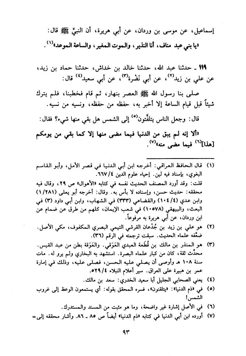 119 - حَدَّثَنَا عَبْدُ اللَّهِ، حَدَّثَنَا خَالِدُ بْنُ خِدَاشٍ، حَدَّثَنَا حَمَّادُ بْنُ زَيْدٍ، عَنْ عَلِيِّ بْنِ زَيْدٍ، عَنْ أَبِي نَضْرَةَ، عَنْ أَبِي سَعِيدٍ، قَالَ: صَلَّى بِنَا رَسُولُ اللَّهِ صَلَّى اللهُ عَلَيْهِ وَسَلَّمَ الْعَصْرَ بِنَهَارٍ، ثُمَّ قَامَ فَخَطَبَنَا، فَلَمْ يَتْرُكْ شَيْئًا قَبْلَ قِيَامِ السَّاعَةِ إِلَّا أَخْبَرَ بِهِ، حَفِظَهُ مَنْ حَفِظَهُ، وَنَسِيَهُ مَنْ نَسِيَهُ، قَالَ: وَجَعَلَ النَّاسُ يَتَلَفَّتُونَ إِلَى الشَّمْسِ هَلْ بَقِيَ مِنْهَا شَيْءٌ؟ فَقَالَ: «§أَلَا إِنَّهُ لَمْ يَبْقَ مِنَ الدُّنْيَا فِيمَا مَضَى مِنْهَا إِلَّا كَمَا بَقِيَ مِنْ يَوْمِكُمْ هَذَا فِيمَا مَضَى مِنْهُ»