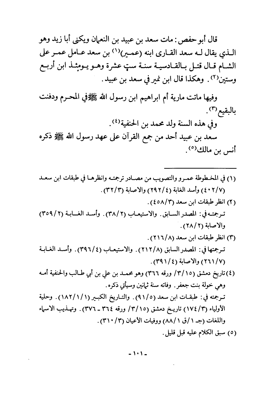 قَالَ أَبُو حَفْص مَاتَ سعد بن عبيد بن النُّعْمَان ويكنى أَبَا زيد وَهُوَ الَّذِي يُقَال لَهُ سعد القارى ابْنه عُمَيْر بن سعد عَامل عمر على الشَّام قَالَ قتل بالقادسية سنة سِتّ عشرَة وَهُوَ يَوْمئِذٍ ابْن أَربع وَسِتِّينَ وَهَكَذَا قَالَ ابْن نمير فِي سعد بن عبيد وفيهَا مَاتَت مَارِيَة أم إِبْرَاهِيم ابْن رَسُول الله صلى الله عَلَيْهِ وَسلم فِي الْمحرم ودفنت بِالبَقِيعِ