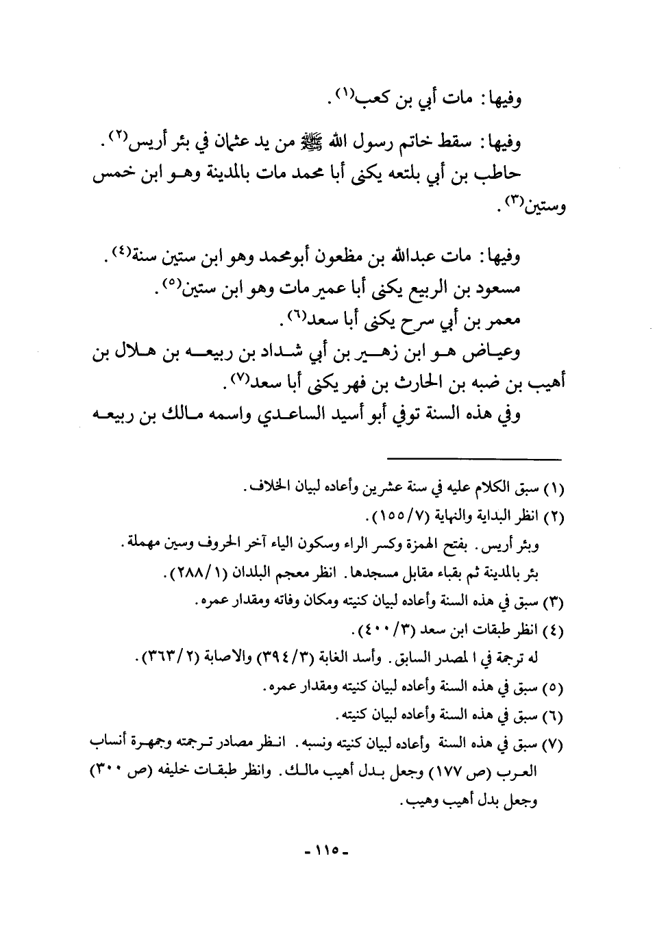 وفيهَا مَاتَ أبي بن كَعْب وفيهَا سقط خَاتم رَسُول الله صلى الله عَلَيْهِ وَسلم من يَد عُثْمَان فِي بِئْر أريس حَاطِب بن أبي بلتعة يكنى أَبَا مُحَمَّد مَاتَ بِالْمَدِينَةِ وَهُوَ ابْن خمس وَسِتِّينَ وفيهَا مَاتَ عبد الله بن مَظْعُون أَبُو مُحَمَّد وَهُوَ ابْن سِتِّينَ سنة مَسْعُود بن الرّبيع يكنى أَبَا عُمَيْر مَاتَ وَهُوَ ابْن سِتِّينَ معمر بن أبي سرح يكنى أَبَا سعد وعياض هُوَ ابْن زُهَيْر بن أبي شَدَّاد بن ربيعَة بن هِلَال بن أهيب بن ضبة بن الْحَارِث بن فهر يكنى أَبَا سعد وَفِي هَذِه السّنة توفّي أَبُو أسيد السَّاعِدِيّ واسْمه مَالك بن ربيعَة