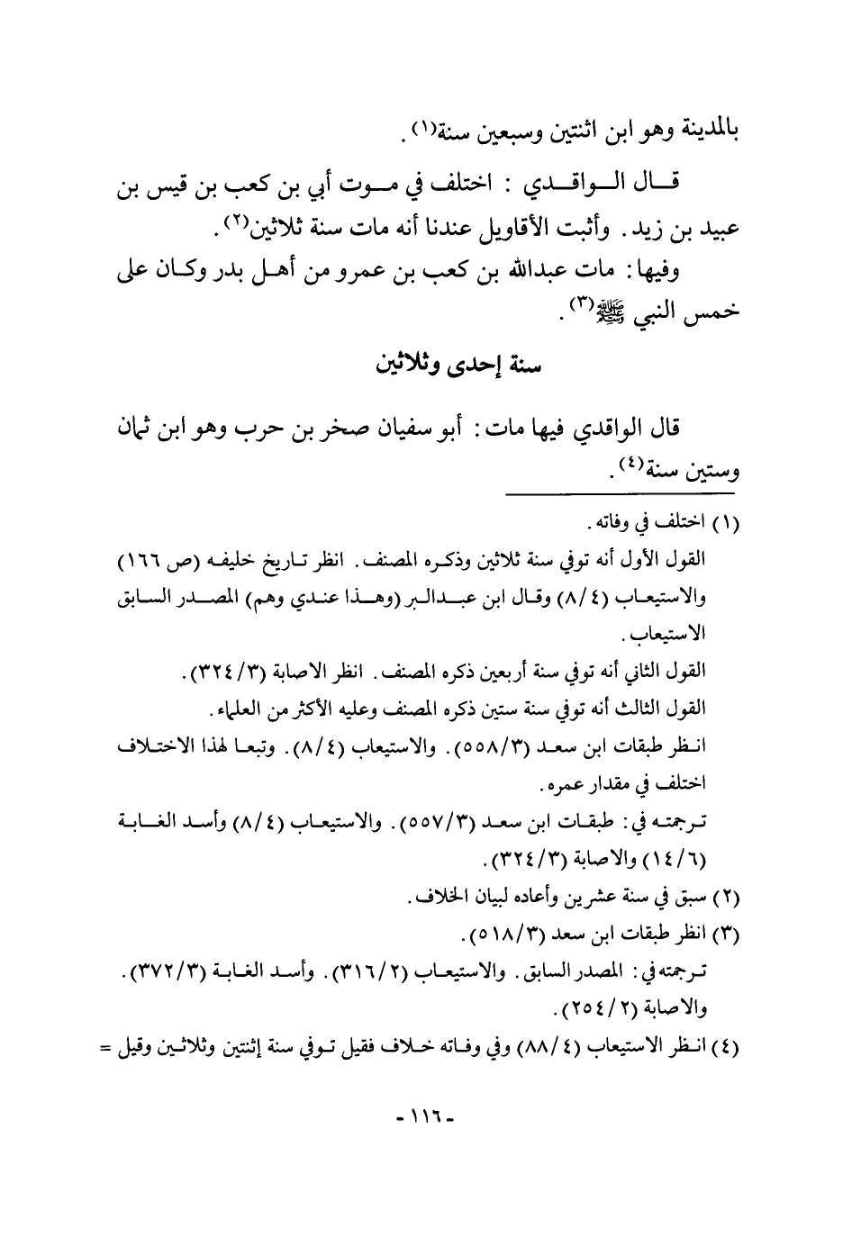 قَالَ الْوَاقِدِيّ فِيهَا مَاتَ أَبُو سُفْيَان صَخْر بن حَرْب وَهُوَ ابْن ثَمَان وَسِتِّينَ سنة