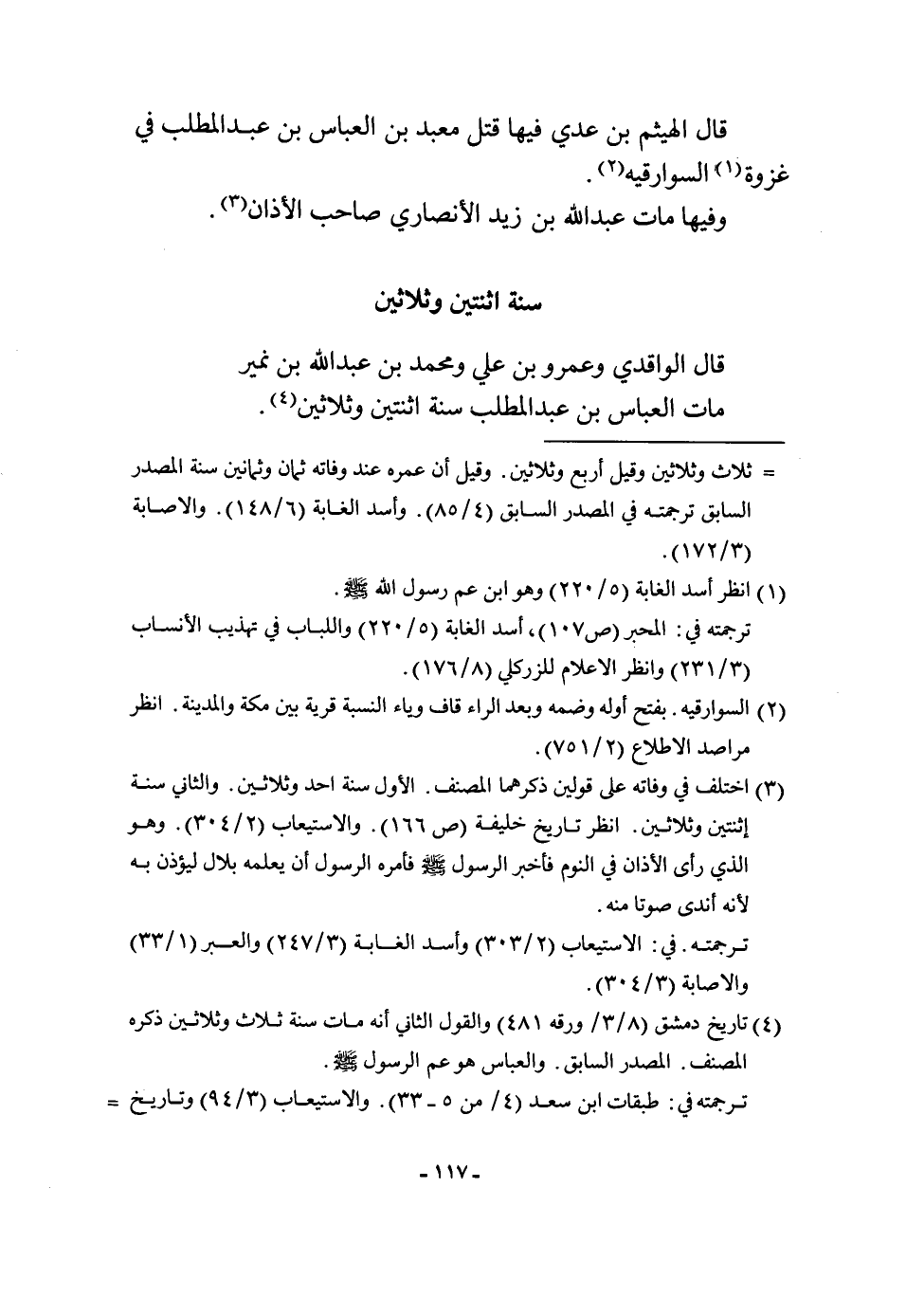 قَالَ الْوَاقِدِيّ وَعَمْرو بن عَليّ وَمُحَمّد بن عبد الله بن نمير مَاتَ الْعَبَّاس بن عبد الْمطلب سنة اثْنَتَيْنِ وَثَلَاثِينَ