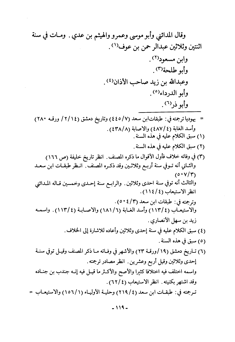 وَقَالَ الْمَدَائِنِي وَأَبُو مُوسَى وَعَمْرو والهيثم بن عدي وَمَات فِي سنة اثْنَتَيْنِ وَثَلَاثِينَ عبد الرَّحْمَن بن عَوْف وَابْن مَسْعُود وَأَبُو طَلْحَة وَعبد الله بن زيد صَاحب الْأَذَان وَأَبُو الدَّرْدَاء وَأَبُو ذَر