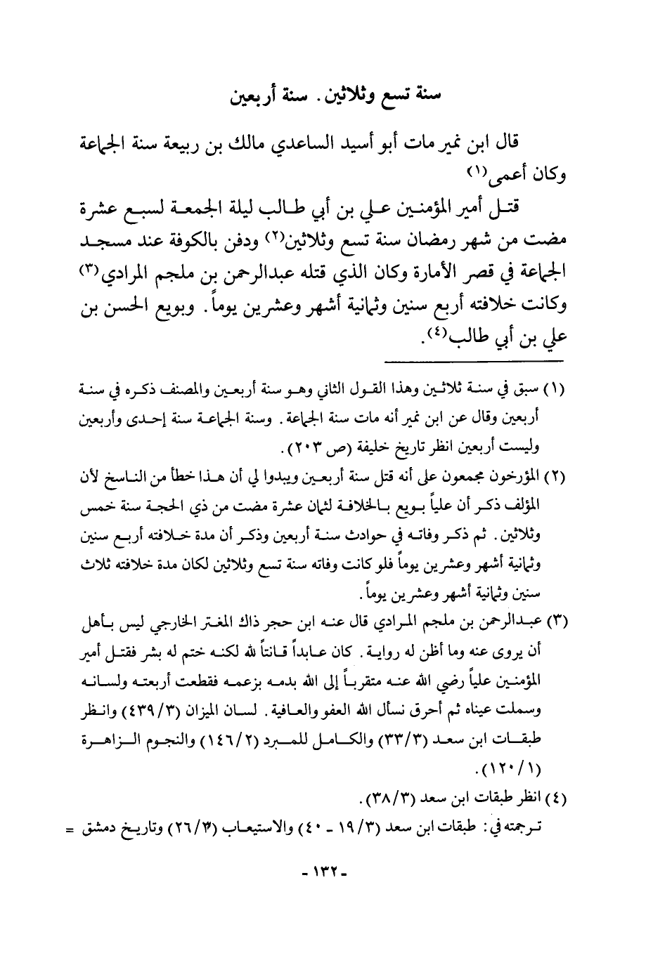 قتل أَمِير الْمُؤمنِينَ عَليّ بن أبي طَالب لَيْلَة الْجُمُعَة لسبع عشرَة مَضَت من شهر رَمَضَان سنة تسع وَثَلَاثِينَ وَدفن بِالْكُوفَةِ عِنْد مَسْجِد الْجَمَاعَة فِي قصر الأمارة وَكَانَ الَّذِي قَتله عبد الرَّحْمَن بن ملجم الْمرَادِي وَكَانَت خِلَافَته أَربع سِنِين وَثَمَانِية أشهر وَعشْرين يَوْمًا وبويع الْحسن بن عَليّ بن أبي طَالب